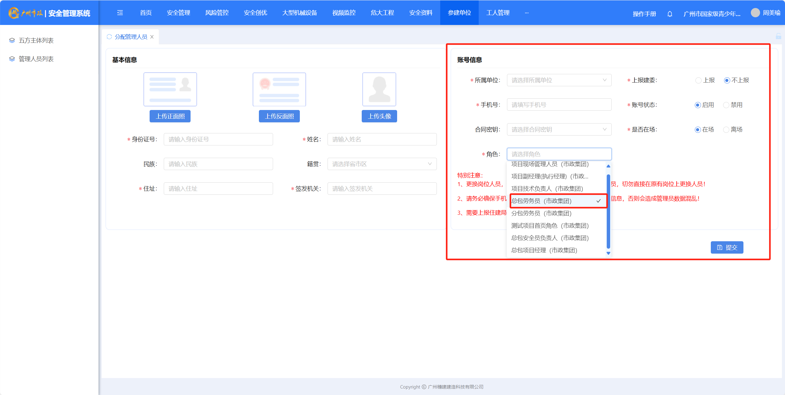 (5)选择所属单位、输入手机号、选择总包劳务员角色