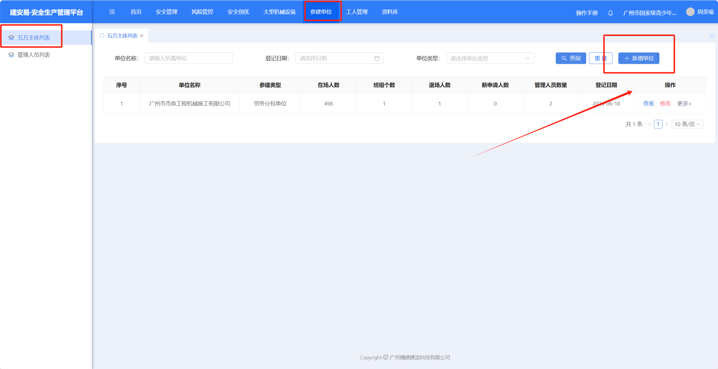 (1)点击【参建单位】-【五方主体列表】打开五方主体列表界面。
