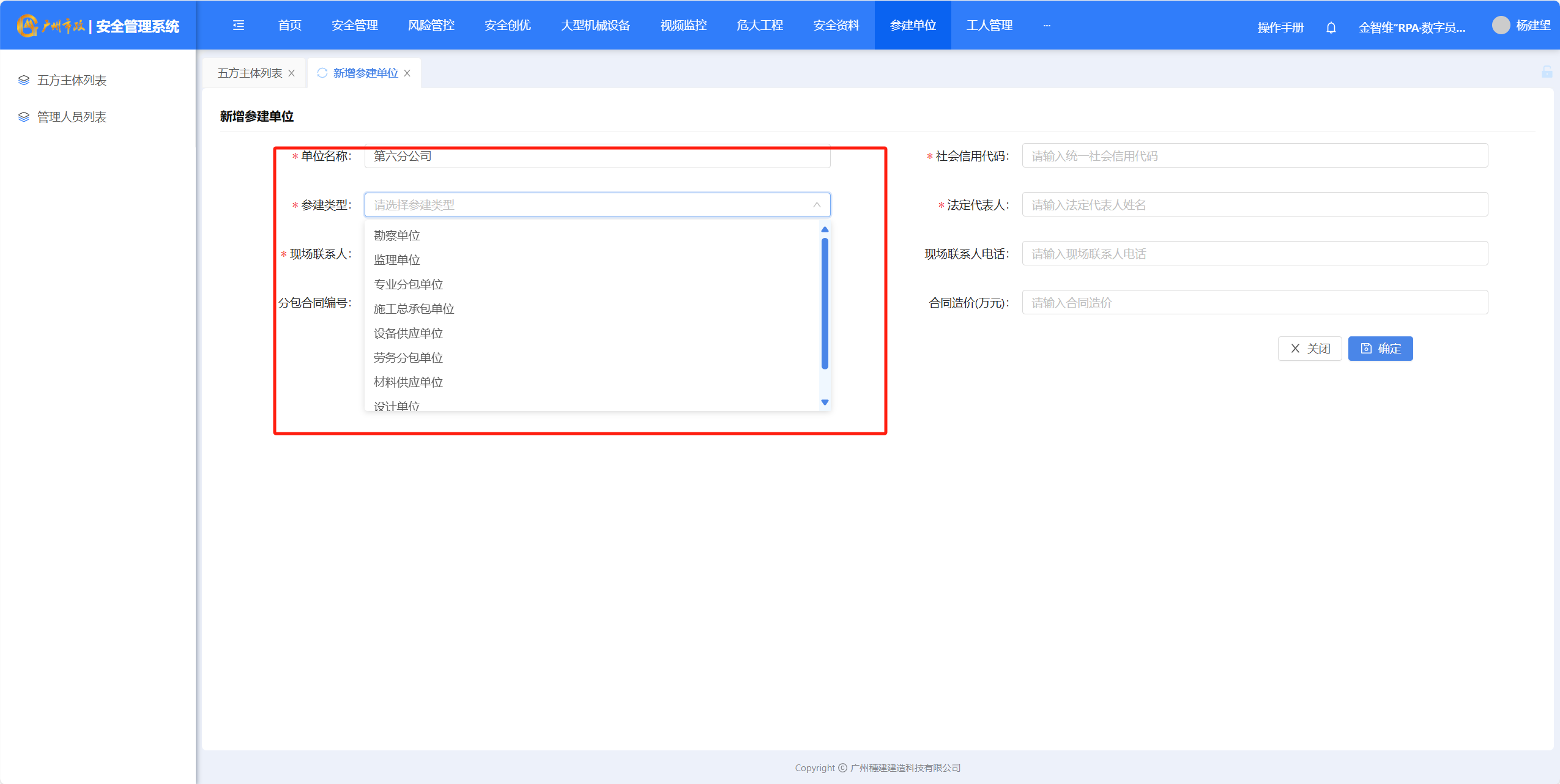 (4)选择参建类型–点击“确定”完成添加参建单位。