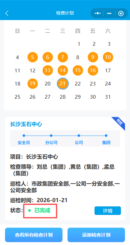 15.1选择通过,点击检查完成按钮,返回检查计划列表再次进入刚刚的检查计划,下面会生成完整检查记录单、整改回复的文件。完成检查计划流程。