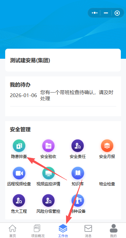 1.集团安全部管理人员点击工作台的隐患排查