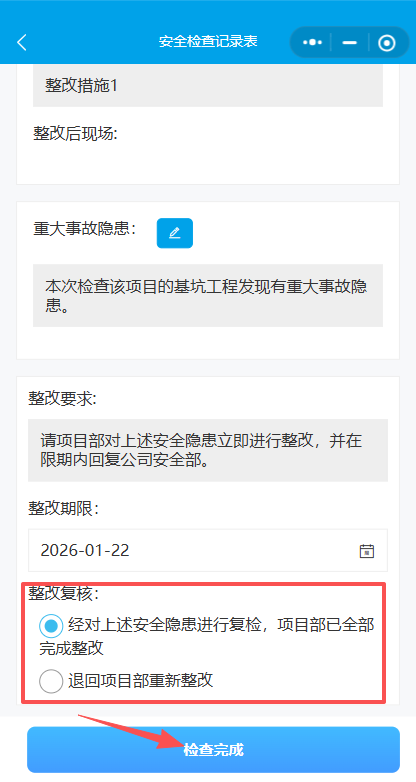 15.3选择退回项目重新整改,点击检查完成按钮,该笔巡检单状态重新变更为“整改中”退回项目部重新进行整改。