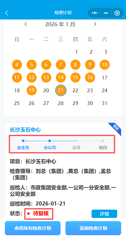 13.根据巡检单状态,登录对应账号进行复核(若复核发现未整改完毕可驳回项目重新进行整改)