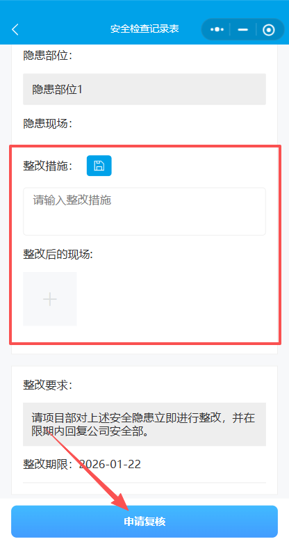 11.项目安全员对隐患进行整改,整改后“申请复核”