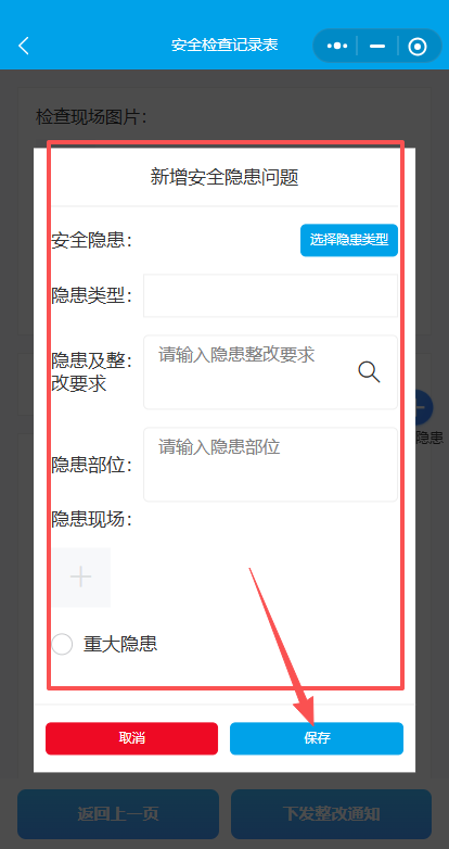 9.选择隐患类型,填写隐患部位,上传现场图片,点击保存。若有多个隐患点击加号添加
