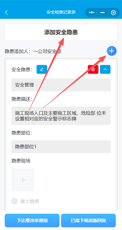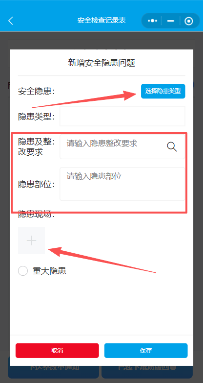 7.检查人创建好检查计划后,系统会提示检查人进行现场检查,点击填写检查记录,右上角加号添加安全隐患问题,输入隐患部位上传照片附件点击保存, 如果有多条安全隐患问题,点击加号进行添加。