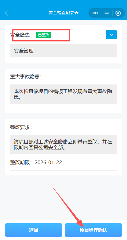 10.项目经理确认整改情况,确认后检查单变成待复核状态。