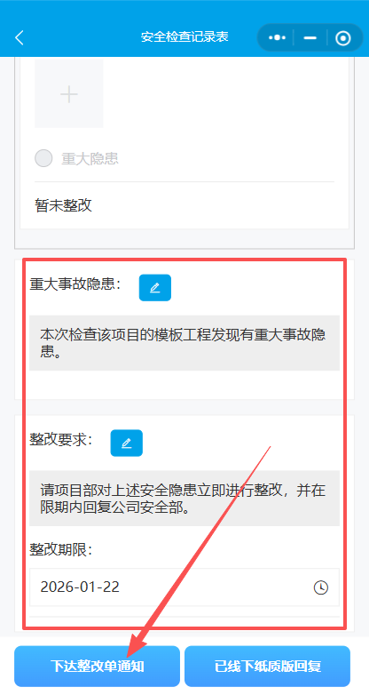 8.输入安全隐患、整改要求、整改期限后,点击下发整改单。