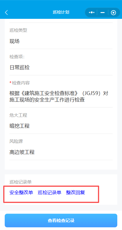 11.1 选择项目已完成整改,点击检查完成按钮,返回检查计划列表再次进入刚刚的检查计划,下面会生成完整检查记录单、整改回复的文件。完成检查计划流程。