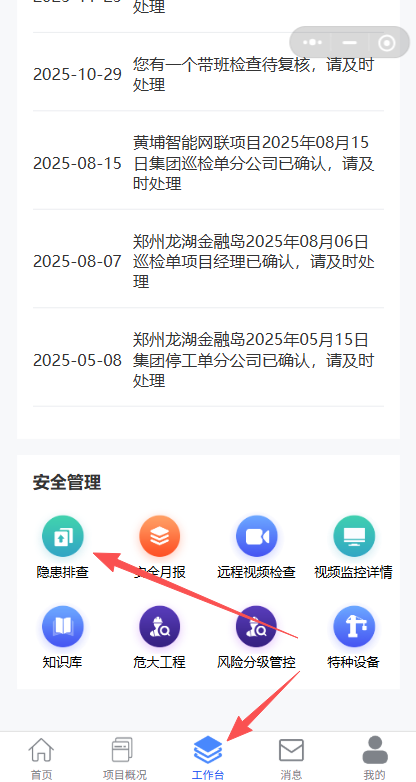 1.公司安全部门管理人员点击工作台的隐患排查。