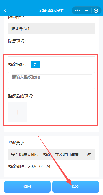 8.项目安全员对隐患进行整改并提交项目经理确认是否整改完毕。