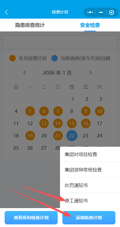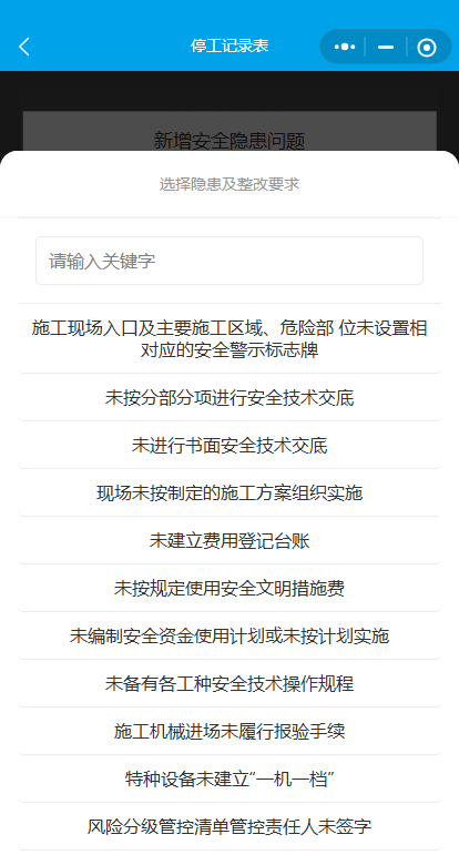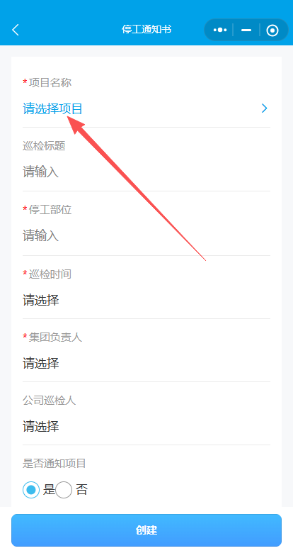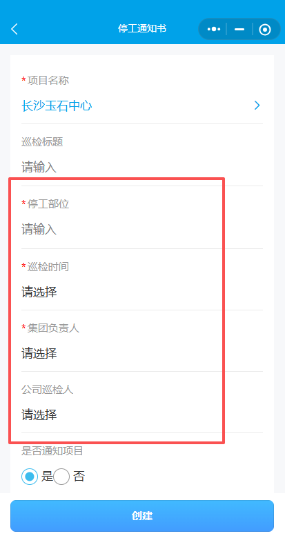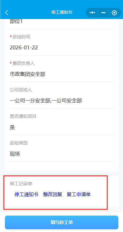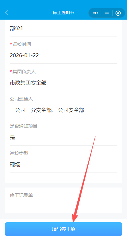4.输入停工部位、选择检查时间、选择集团负责人、公司、分公司巡检人 (公司安全部门人员、分公司安全部门人员)