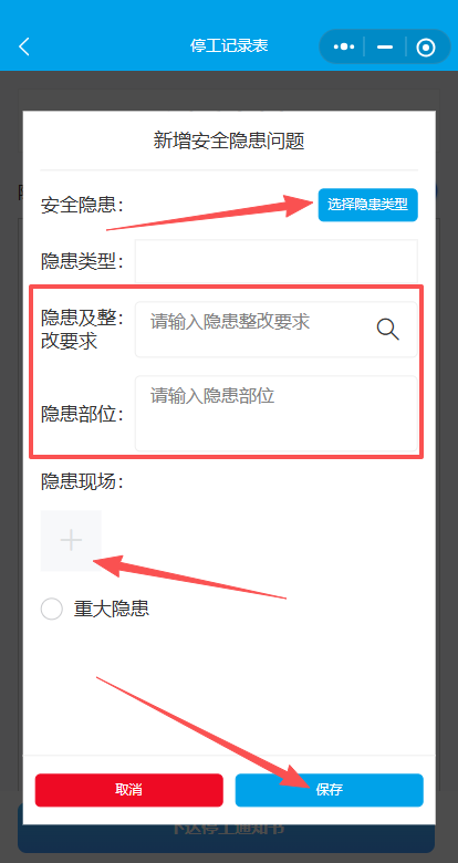 6.进入页面添加安全隐患问题,输入隐患部位上传照片附件点击保存, 如果有多条安全隐患问题,点击加号进行添加。