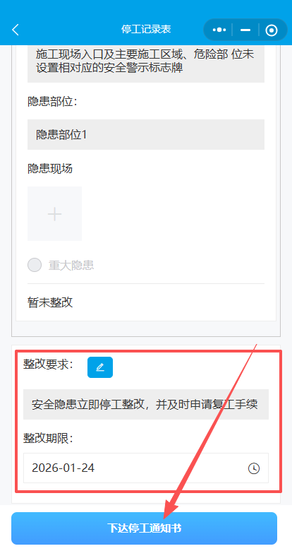 7.输入整改要求、整改期限后,点击下发停工通知书