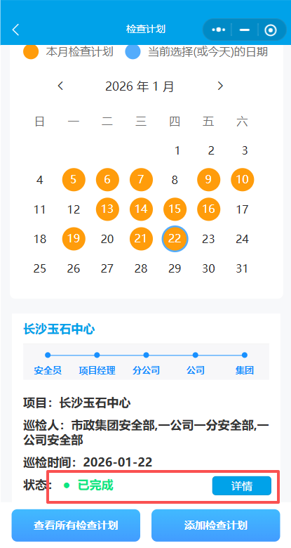 13.1选择通过,点击检查完成按钮,返回检查计划列表再次进入刚刚的检查计划,下面会生成完整检查记录单、整改回复的文件。完成检查计划流程。