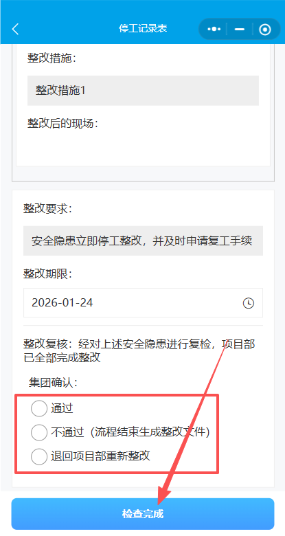 (共三种复核结果:1.项目已完成整改、2.整改不合格(流程结束生成整改文件)、3.退回项目重新整改)