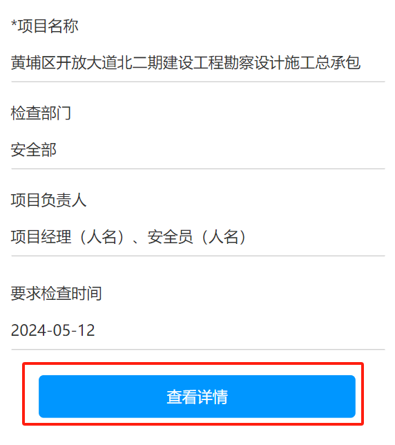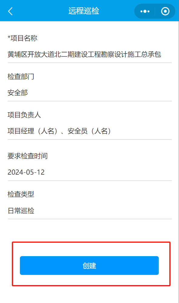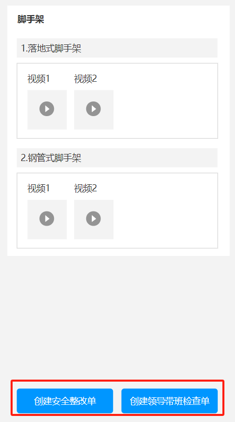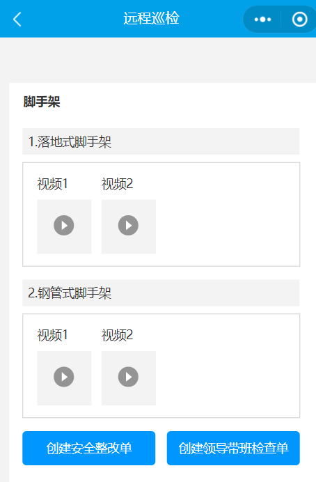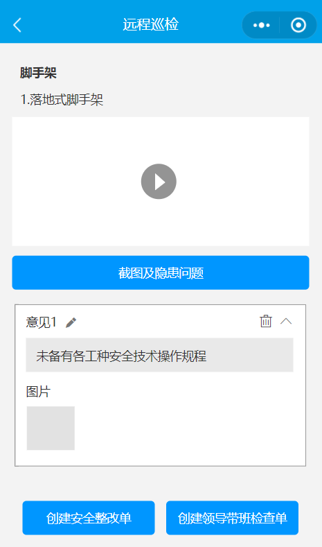 8. 填写完成之后,点击确定。生成一条隐患记录。点击【创建安全整改单】/【创建领导带班检查单】,直接调出现有模块【公司对项目的检查】功能,填写完信息后确定,待所有隐患全部填写完成后,返回视频列表页,点击【生成安全整改单】或【创建领导带班检查单】,以上数据(检查内容、隐患描述、隐患部位、截图)填充至整改单(安全隐患、隐患描述、隐患部位、隐患现场)里。