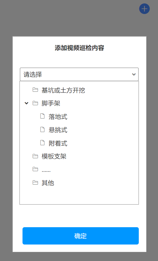 2. 点击“+”号图标,弹出添加视频巡检内容弹窗,选择分类,分类内容如下