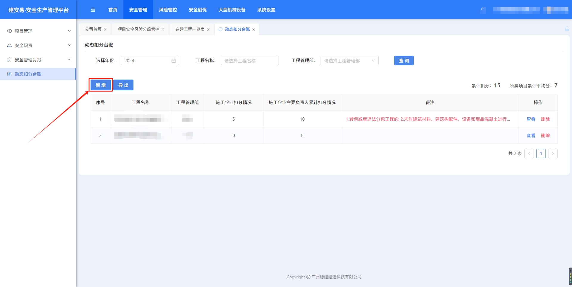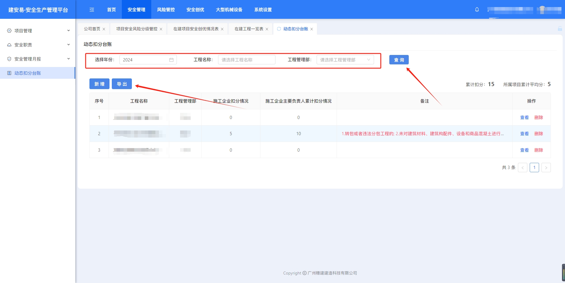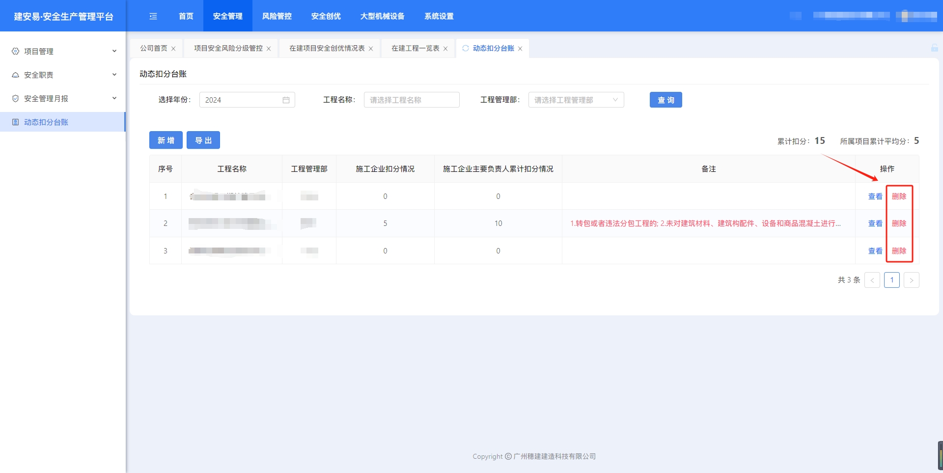 目录 搜索 展开 一、账号开通与登录二、首页三、安全检查/隐患排查(含小程序操作流程)1.集团对项目检查2.集团领导带班检查3.公司对项目检查(公司、分公司)4.公司领导带班检查(公司、分公司)5.集团下发停工通知书6.公司、分公司下发停工通知书7.下发处罚通知书8.项目自查9.远程视频检查10.web端安全隐患排查模块说明四、安全验收操作说明(小程序操作流程)五、安全管理六、项目安全风险分级管控1.项目安全风险分级管控2.安全生产风险排查管控清单汇总七、动态扣分台账八、安全职责九、项目管理十、安全管理月报十一、安全创优十二、机械设备十三、标准化考评十四、预警十五、安全教育培训十六、应急管理十七、知识库十八、视频监控十九、施工安全日志二十、系统设置二十一、劳务管理(项目设置、工人进退场)1.劳务项目初始化设置2.工人入场流程(含三级安全教育)3.工人退场流程4.班前教育二十二、危大工程 暂无相关搜索结果! 阅读次数:52 本文档使用 MinDoc 发布 七、动态扣分台账 七、动态扣分1.新增扣分项集团、公司账号,打开“动态扣分台账”,点击“新建”选择年份、项目和项目所属公司,点击“填写扣分表”。点击“添加扣分项”选择扣分项,点击“确定”完成新增 2.查看、导出excel、删除点击“查看”,可以编辑扣分项筛选“查询”,点击“导出”下载excel表格点击“删除”,删除扣分项作者:周子艺 创建时间:2026-03-23 11:39最后编辑:周子艺 更新时间:2026-03-25 15:35