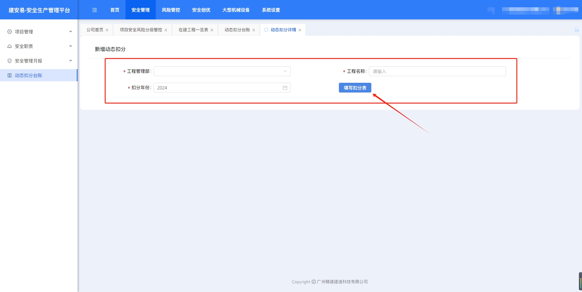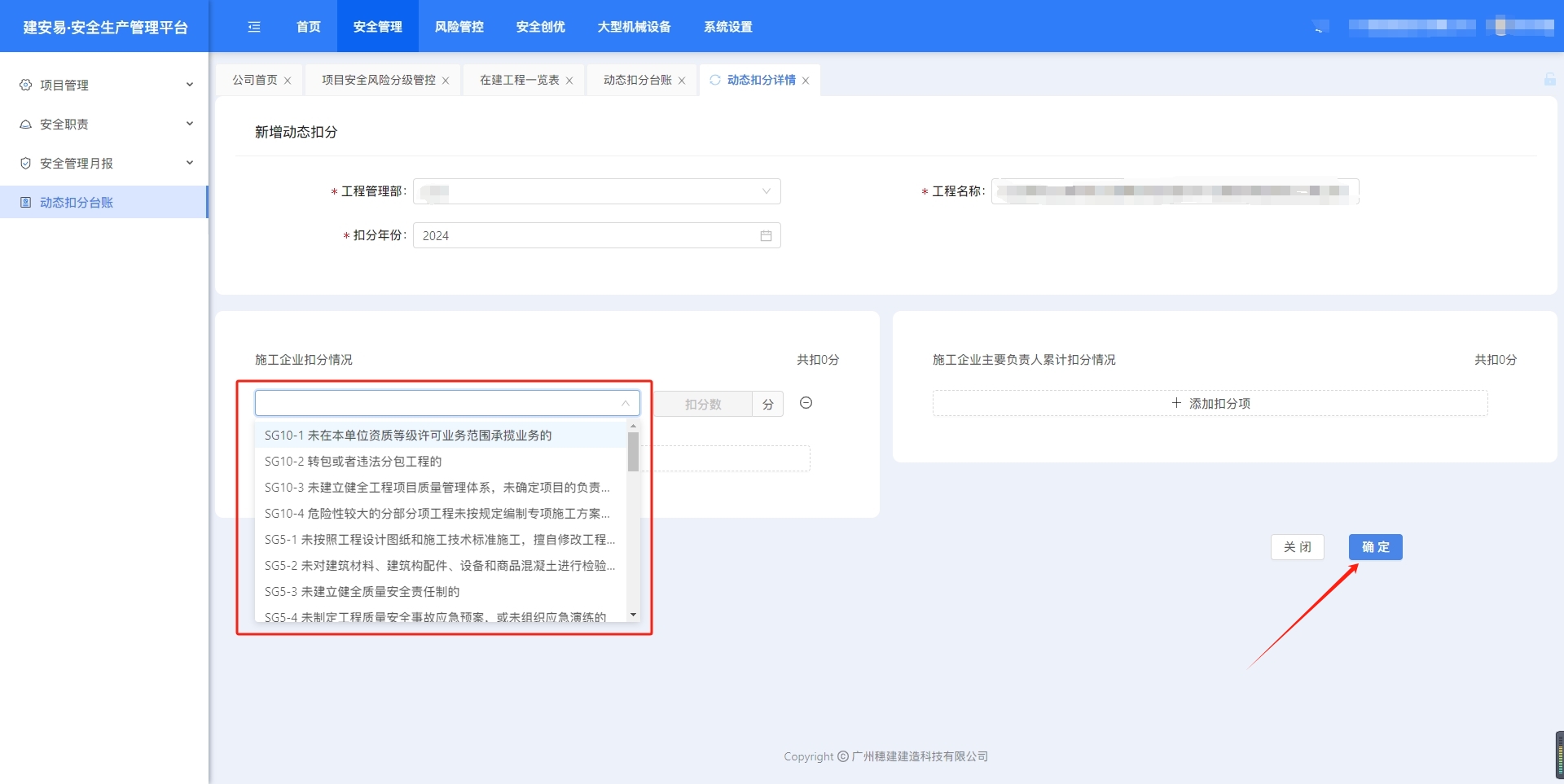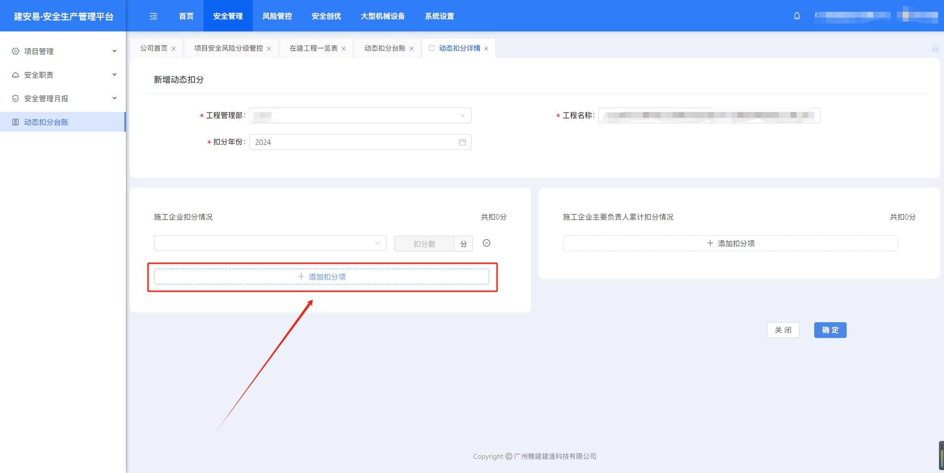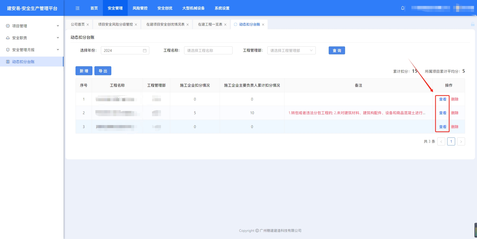 目录 搜索 展开 一、账号开通与登录二、首页三、安全检查/隐患排查(含小程序操作流程)1.集团对项目检查2.集团领导带班检查3.公司对项目检查(公司、分公司)4.公司领导带班检查(公司、分公司)5.集团下发停工通知书6.公司、分公司下发停工通知书7.下发处罚通知书8.项目自查9.远程视频检查10.web端安全隐患排查模块说明四、安全验收操作说明(小程序操作流程)五、安全管理六、项目安全风险分级管控1.项目安全风险分级管控2.安全生产风险排查管控清单汇总七、动态扣分台账八、安全职责九、项目管理十、安全管理月报十一、安全创优十二、机械设备十三、标准化考评十四、预警十五、安全教育培训十六、应急管理十七、知识库十八、视频监控十九、施工安全日志二十、系统设置二十一、劳务管理(项目设置、工人进退场)1.劳务项目初始化设置2.工人入场流程(含三级安全教育)3.工人退场流程4.班前教育二十二、危大工程 暂无相关搜索结果! 阅读次数:52 本文档使用 MinDoc 发布 七、动态扣分台账 七、动态扣分1.新增扣分项集团、公司账号,打开“动态扣分台账”,点击“新建”选择年份、项目和项目所属公司,点击“填写扣分表”。点击“添加扣分项”选择扣分项,点击“确定”完成新增 2.查看、导出excel、删除点击“查看”,可以编辑扣分项筛选“查询”,点击“导出”下载excel表格点击“删除”,删除扣分项作者:周子艺 创建时间:2026-03-23 11:39最后编辑:周子艺 更新时间:2026-03-25 15:35