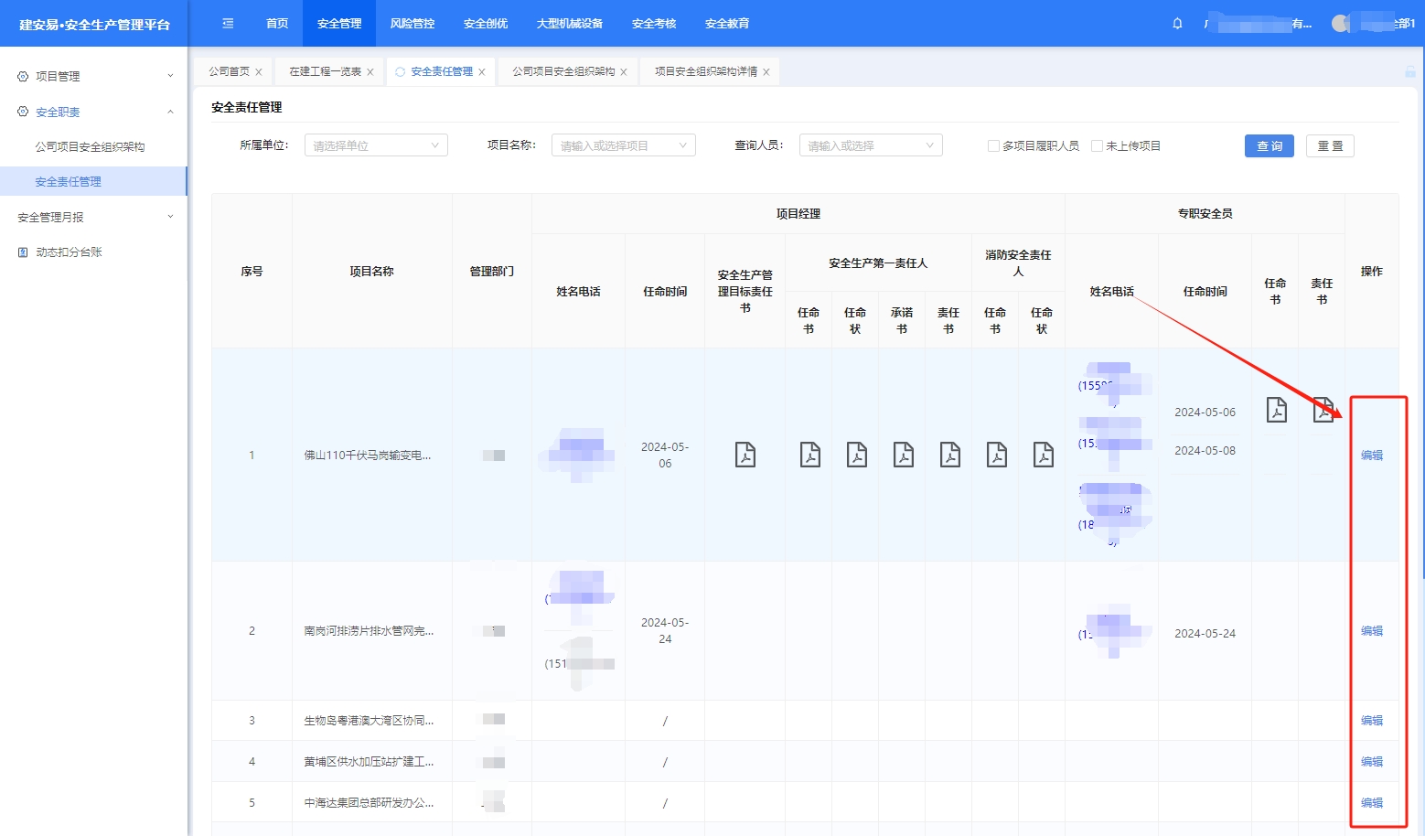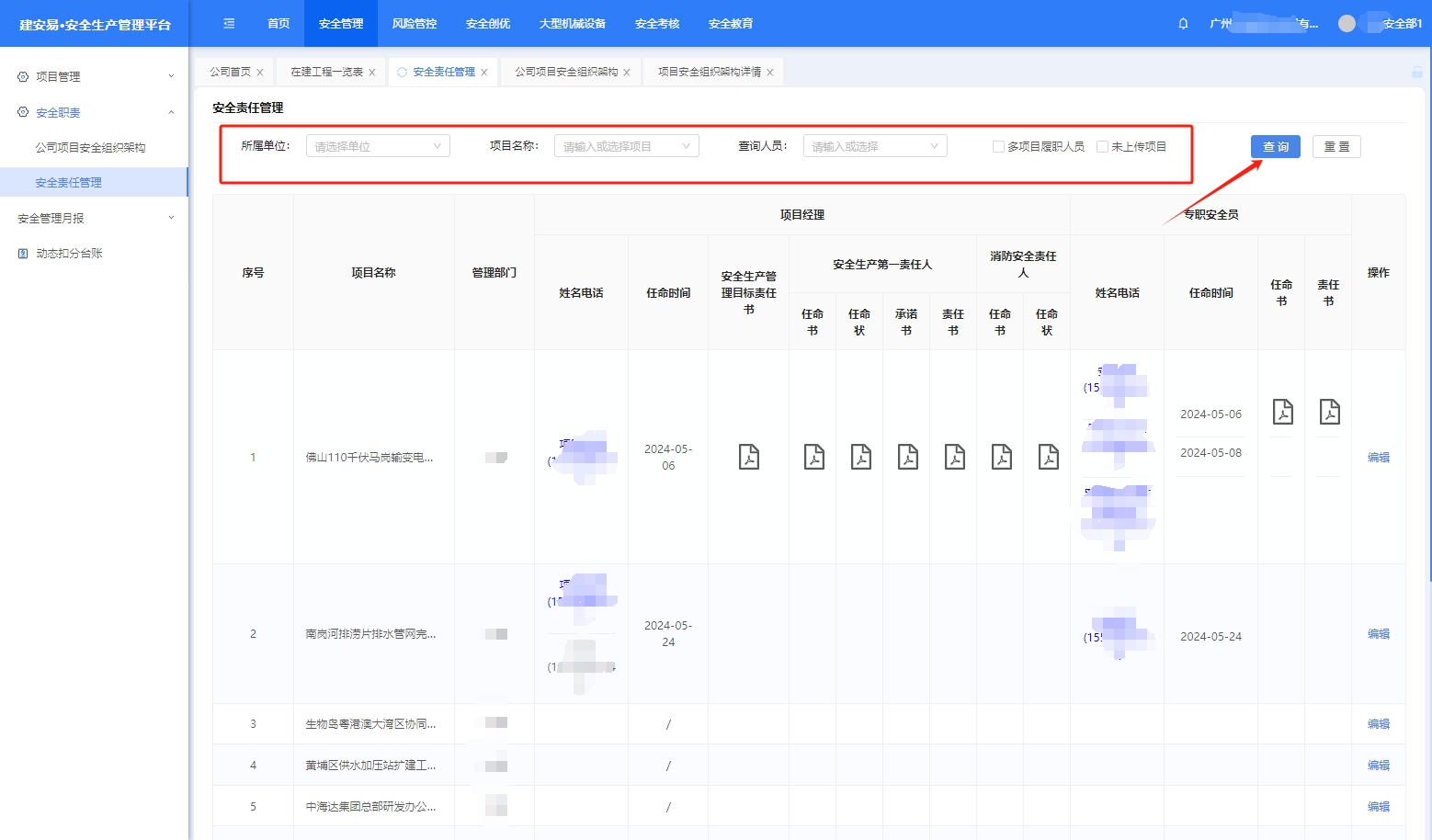 企业账号或项目账号打开“安全管理”-“安全责任”-“安全责任管理”,筛选点击“查询”,可查看项目责任状、任命书等附件上传情况