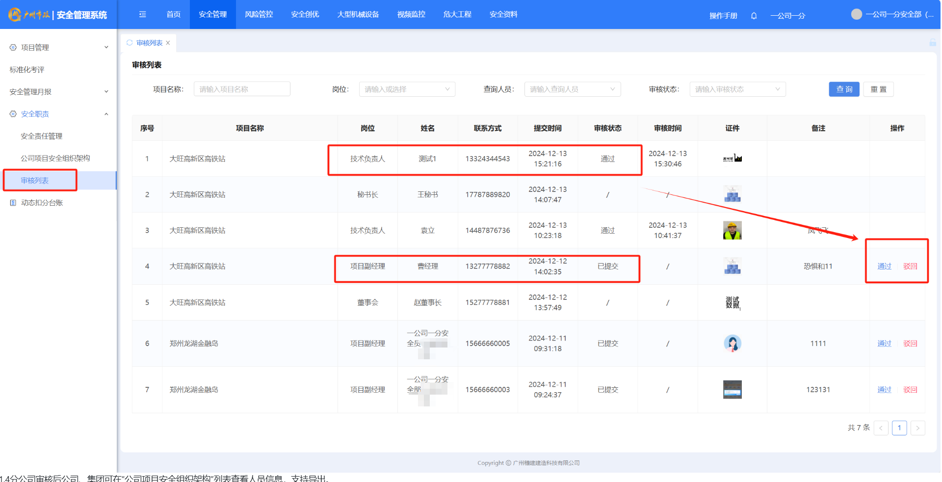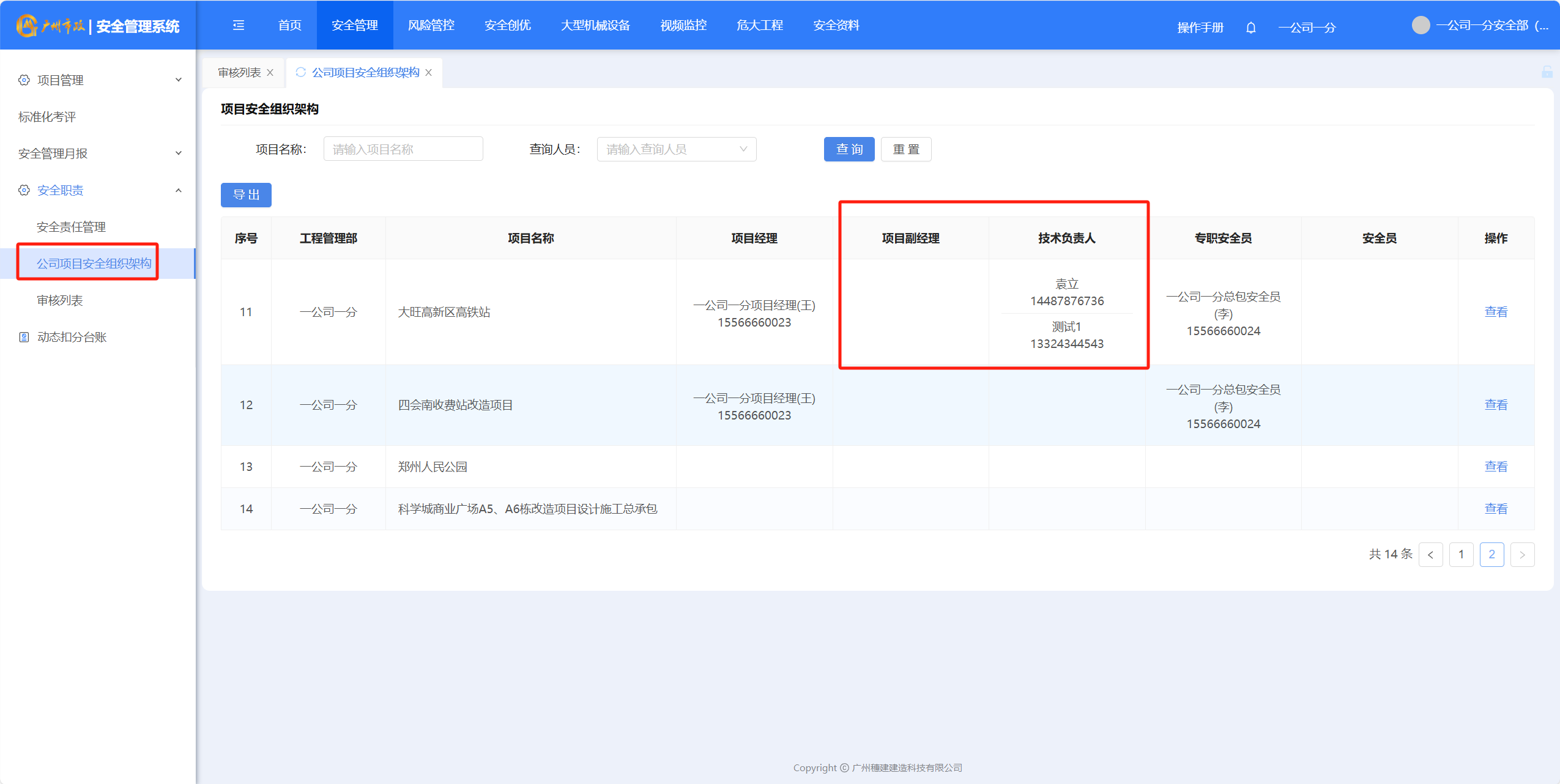 1.4分公司审核后公司、集团可在“公司项目安全组织架构”列表查看人员信息,支持导出。