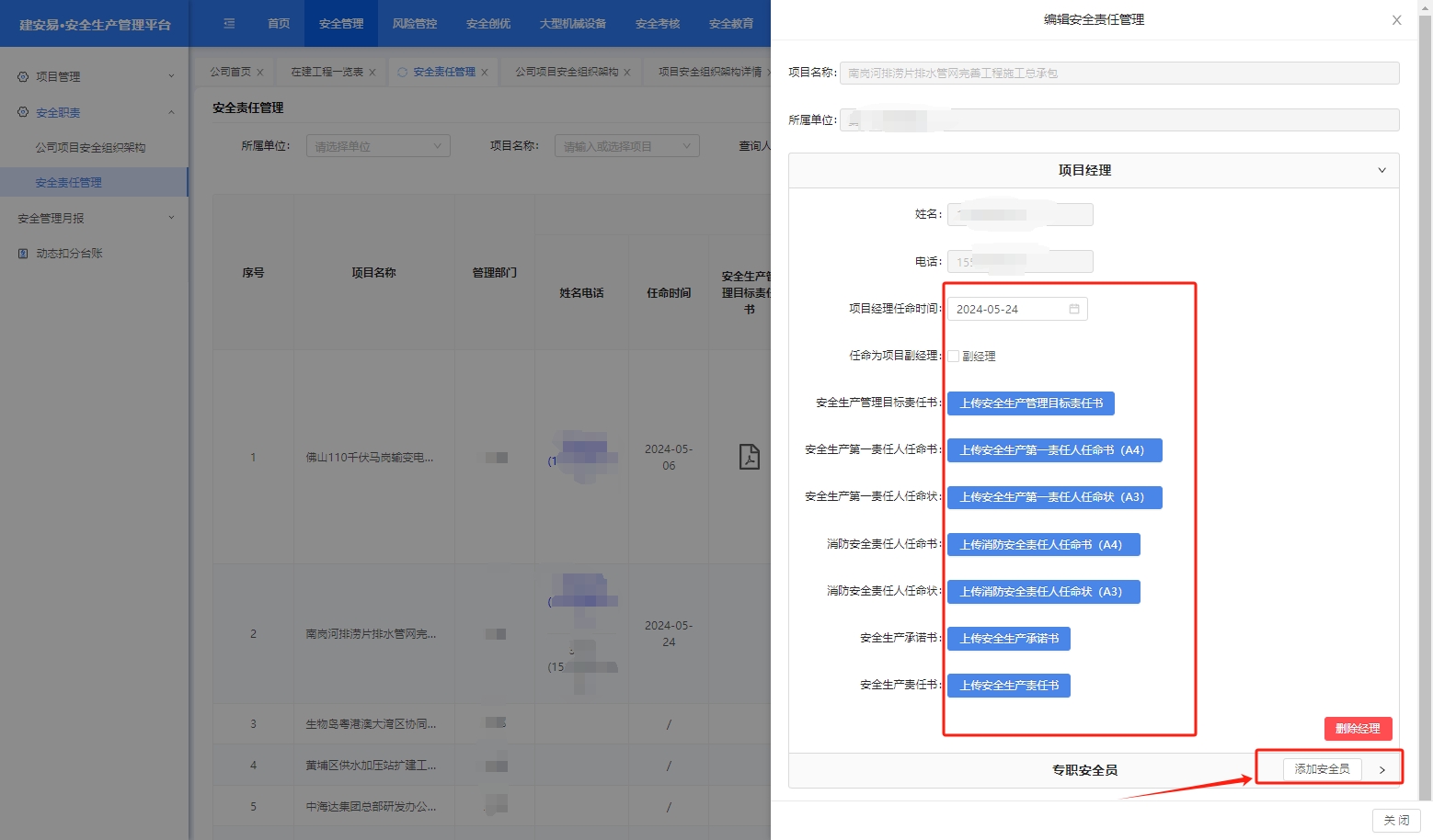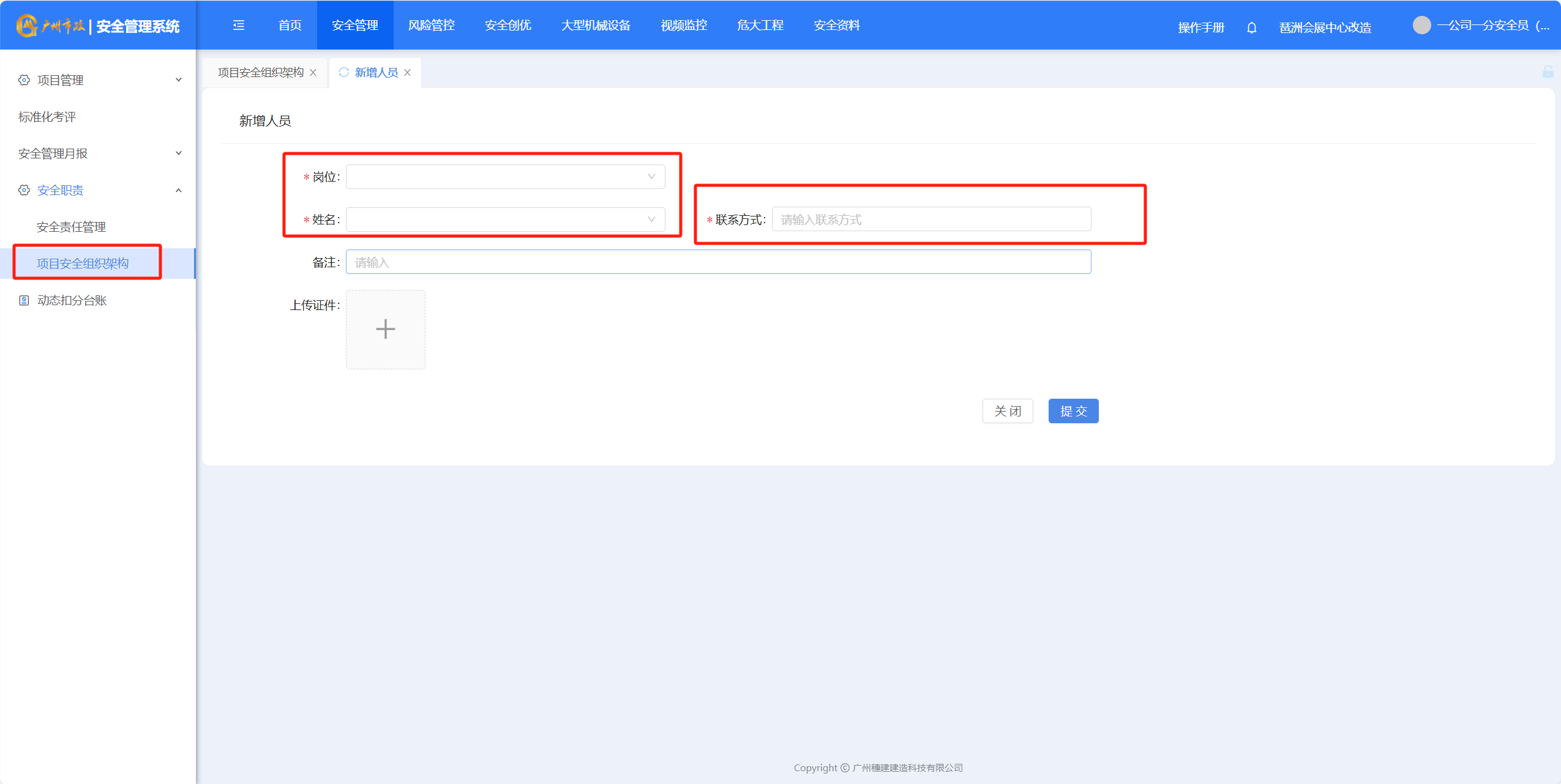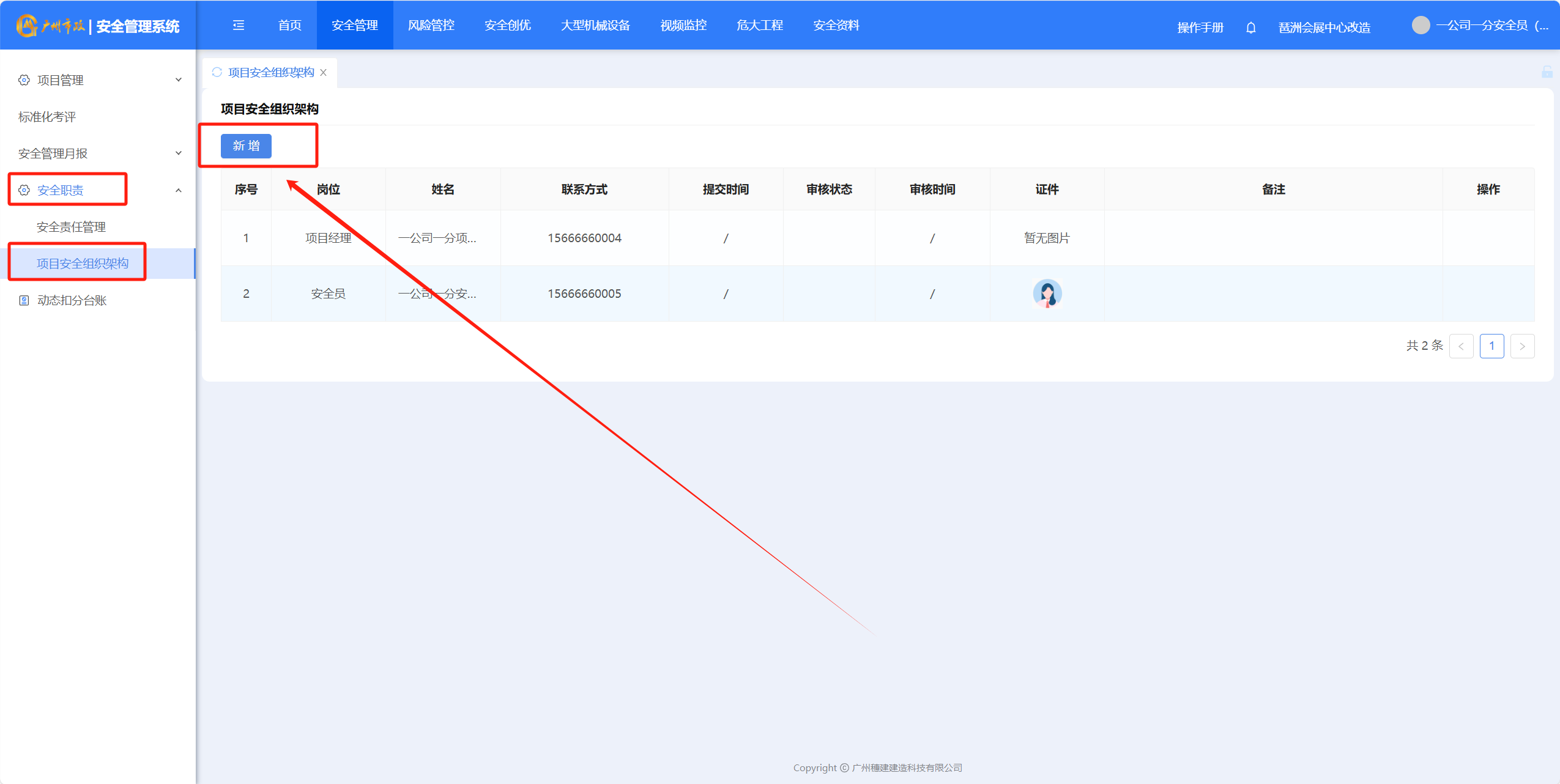 1.1项目账号打开“安全管理”-“安全职责”-“项目安全组织架构”,点击新增,添加项目岗位人员。
