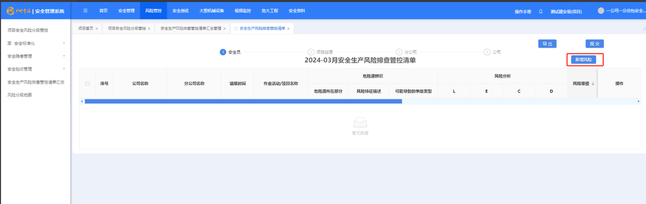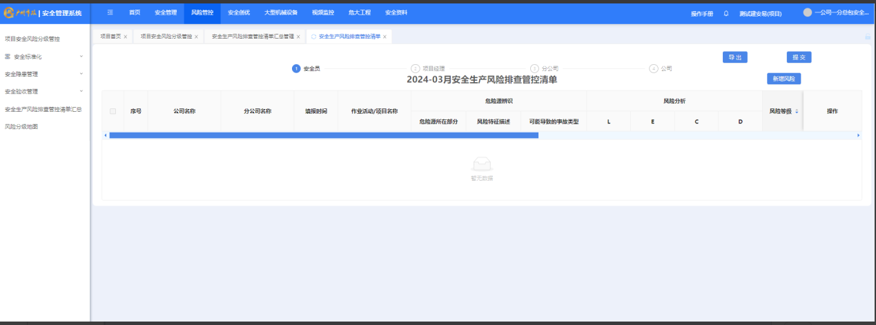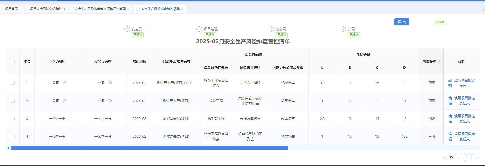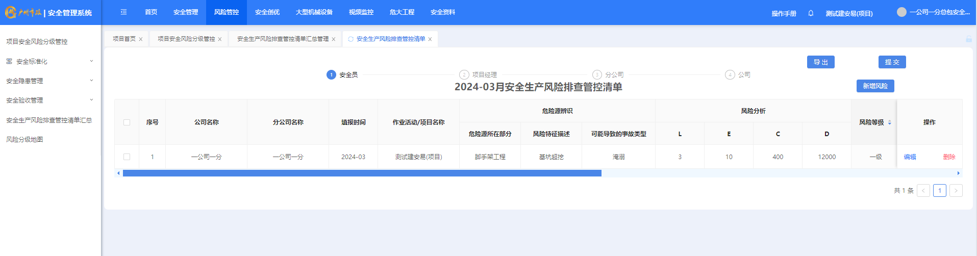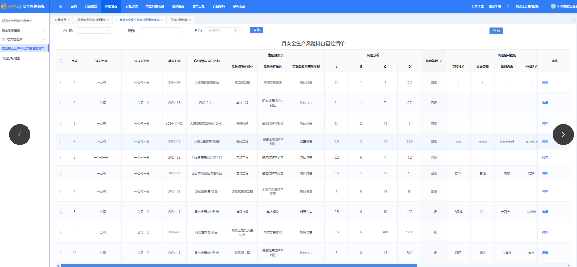 集团可在【风险管控】的【集团安全生产风险排查管控清单】查看所有项目提交上来的一二级风险。