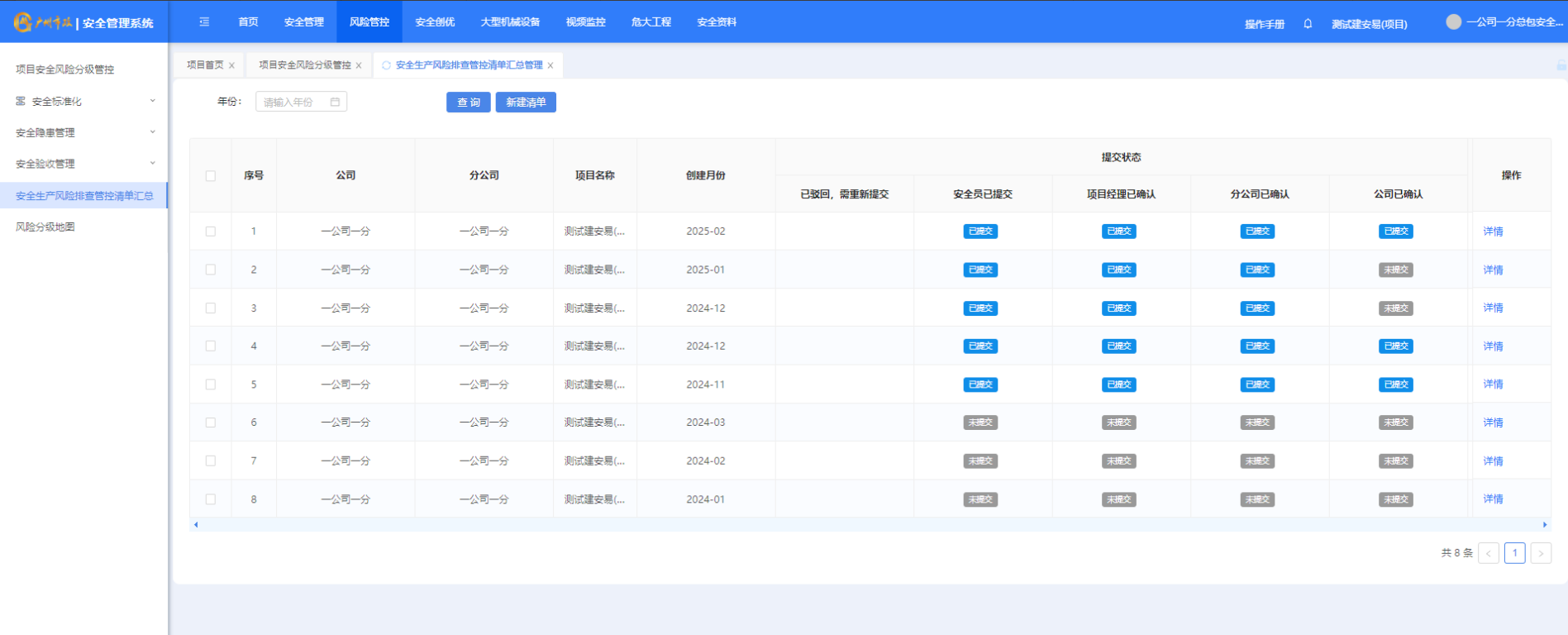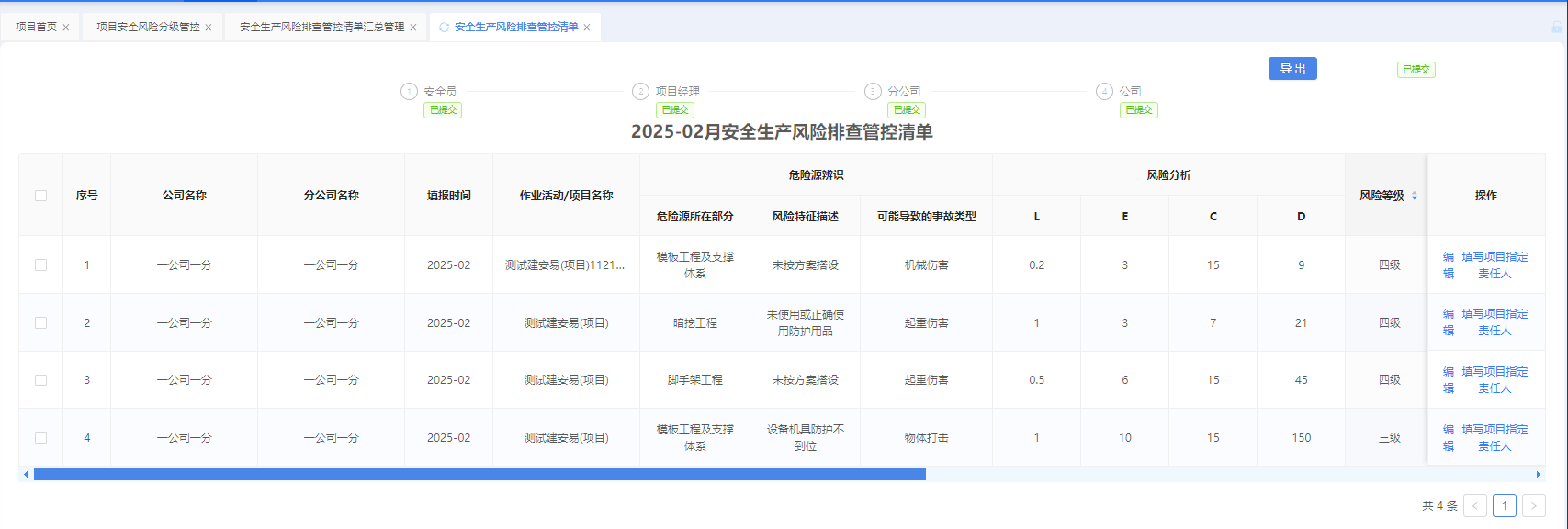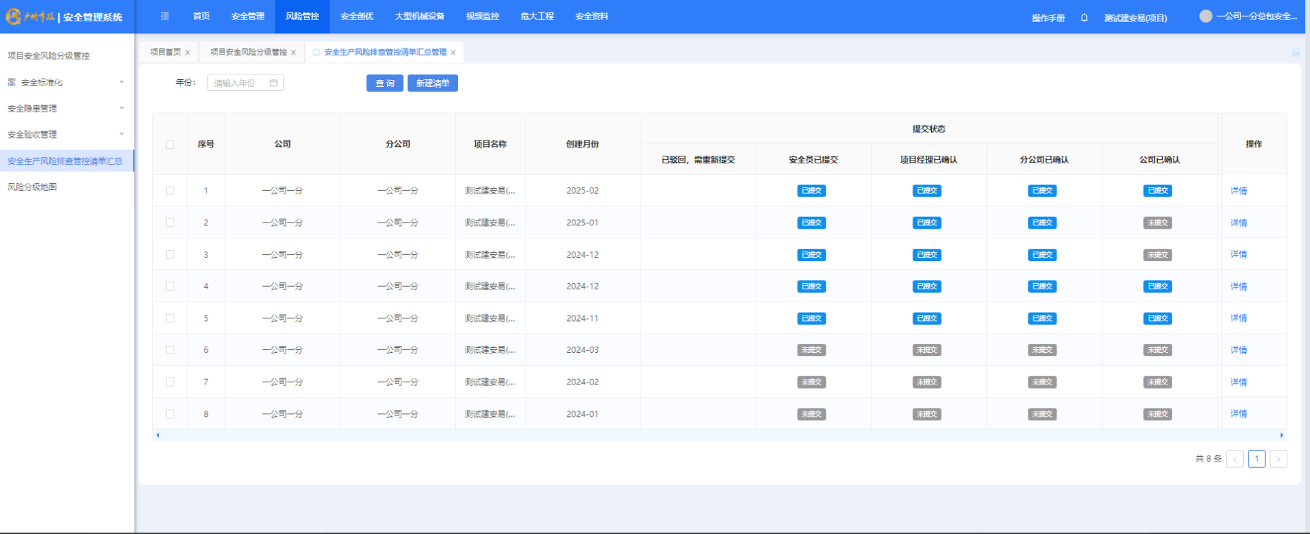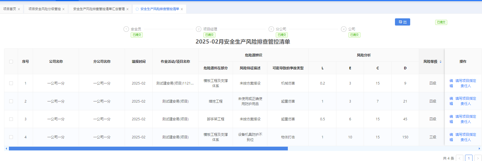 集团可在【风险管控】的【集团安全生产风险排查管控清单】查看所有项目提交上来的一二级风险。