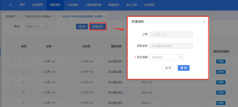 1.找到【风险管控】,左侧找【到安全生产风险排查管控清单汇总】查看项目级提交上来的月度汇总清单。