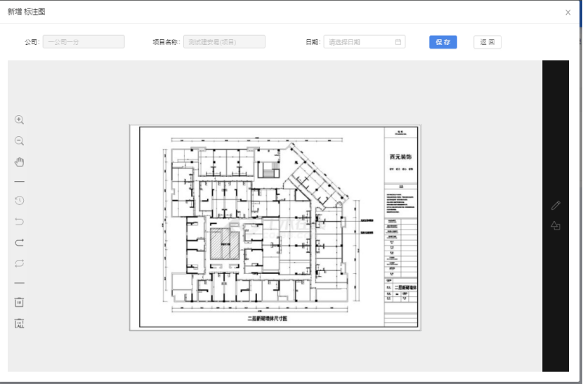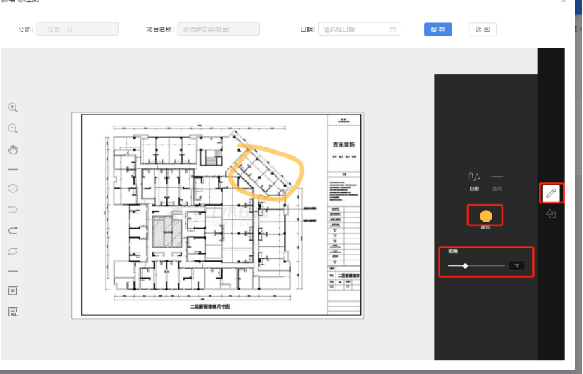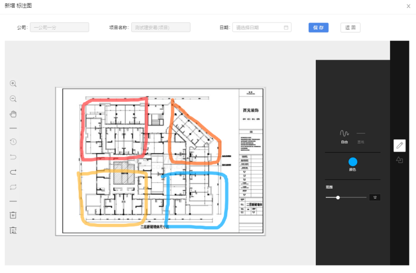 5.风险分级地图。项目开工时上传平面图,安全员在系统中选择项目的平面图,用画图控件画风险颜色(一级红,橙,黄,蓝色),每个月更新风险管控表后,再画时重新在平面图中画风险颜色。