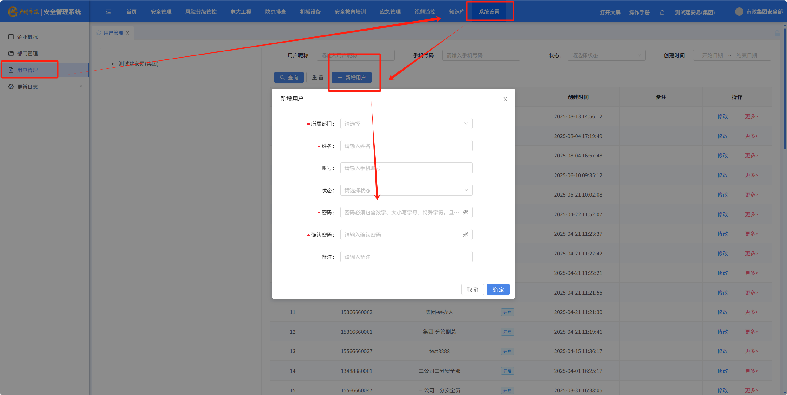集团层级、公司层级点击系统设置–用户管理–新增用户;输入相关信息添加用户账号
