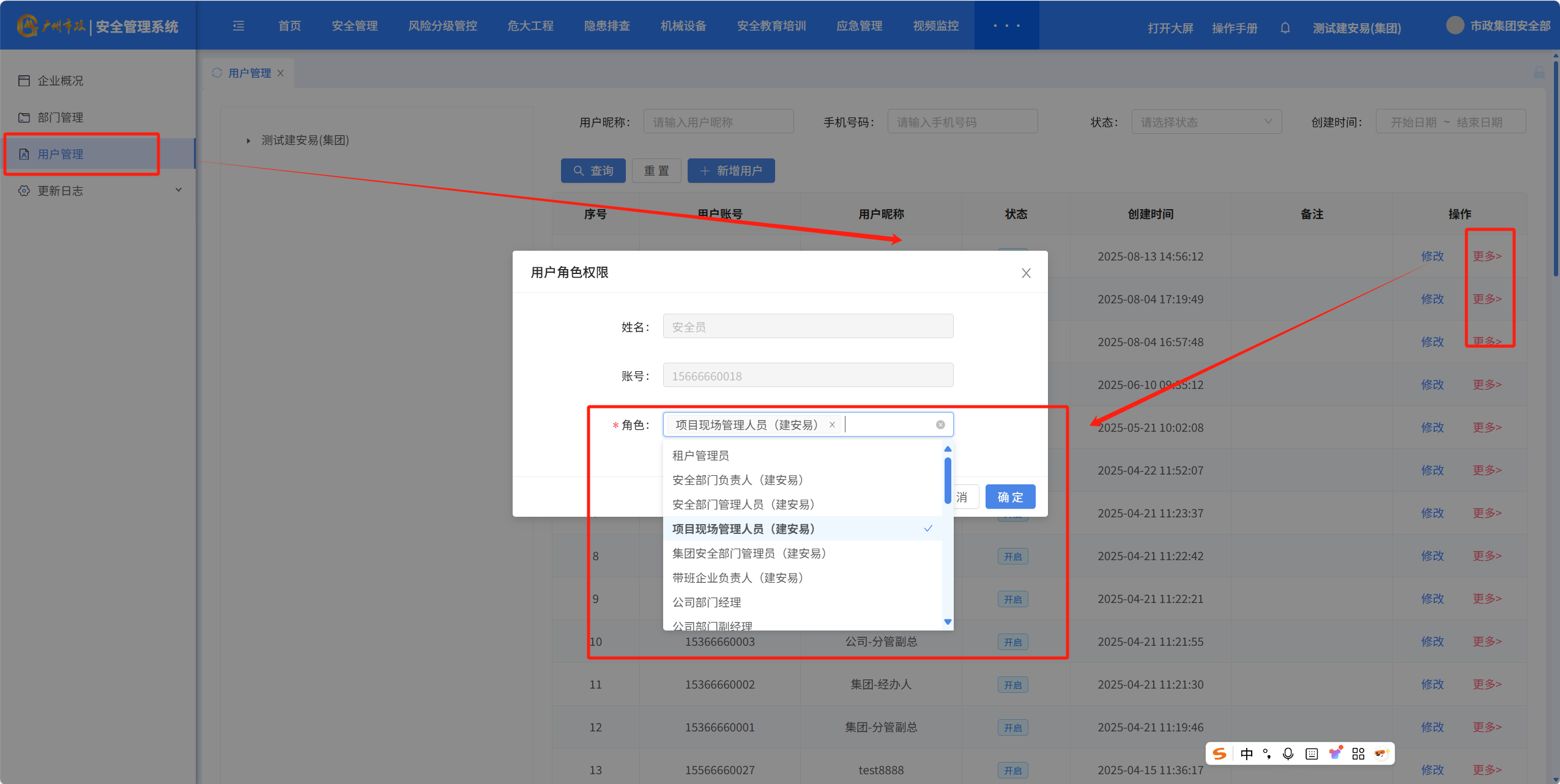 若账号为分公司层级账号,则需要选择分配“安全部门负责人”角色;若该账号为公司经理还可叠加分配“公司部门经理或公司部门副经理”