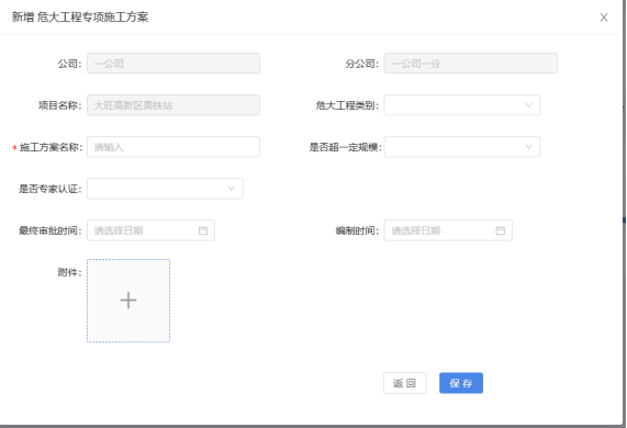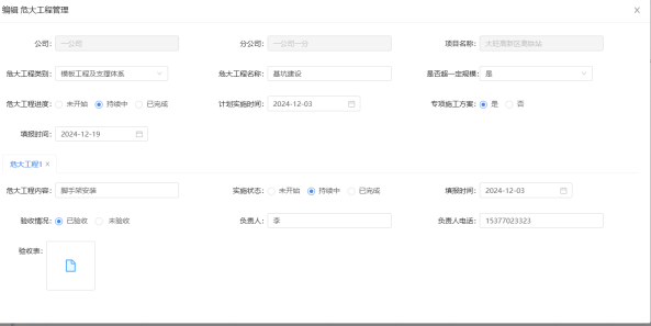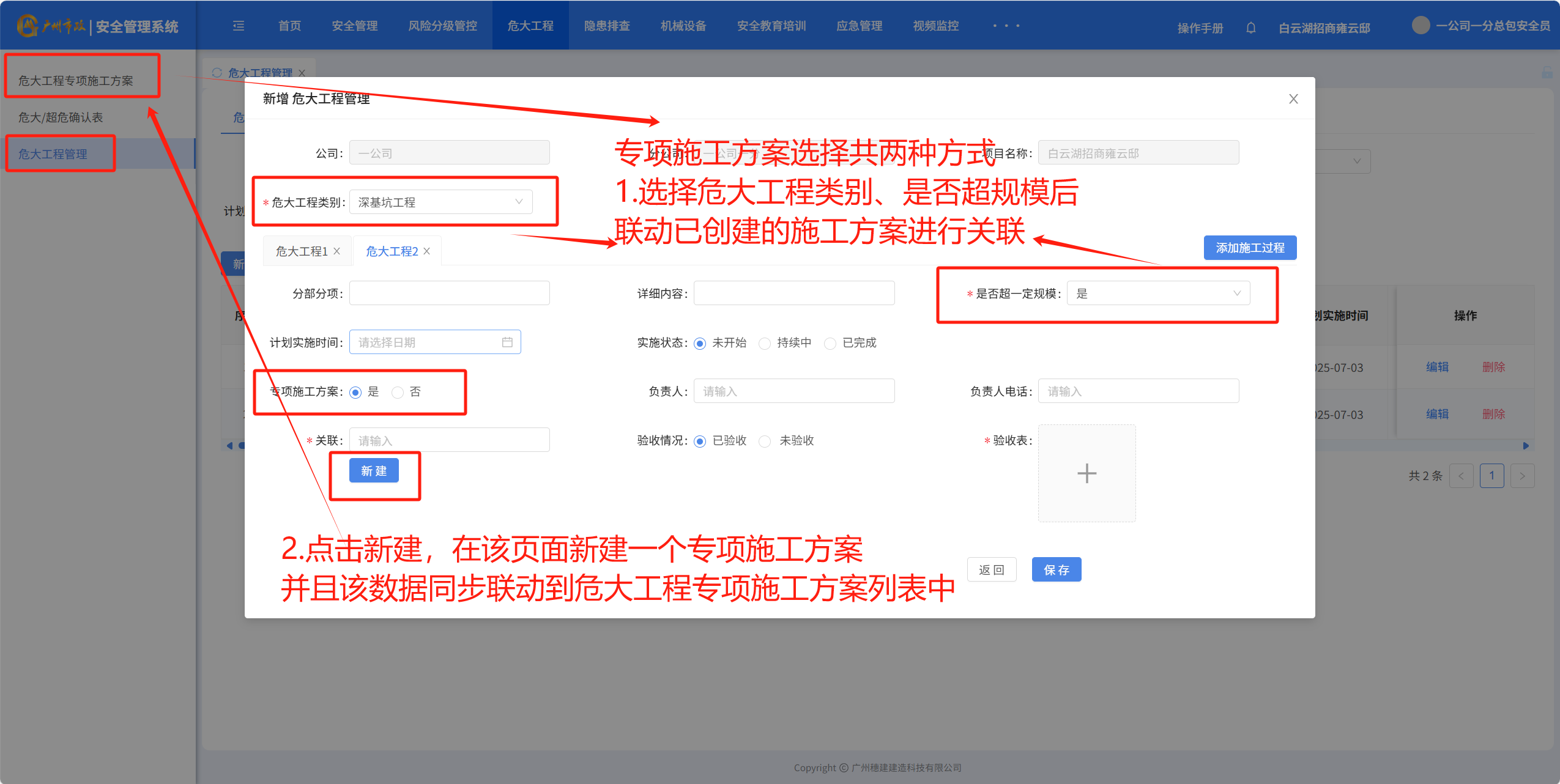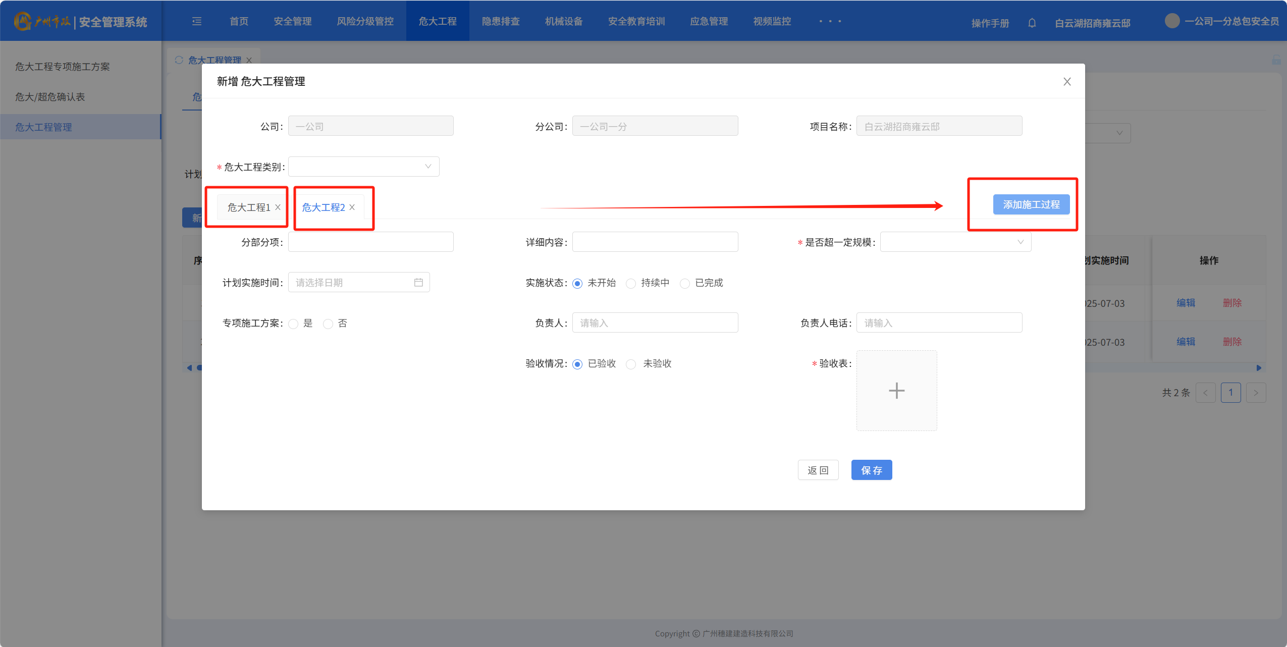 点击“添加施工工程”按钮,对危大工程进行新增,例如“危大工程2”,填写完成后保存。