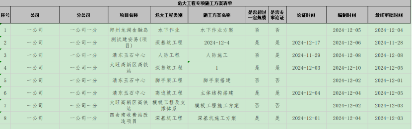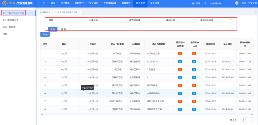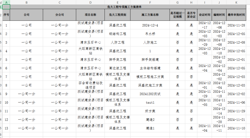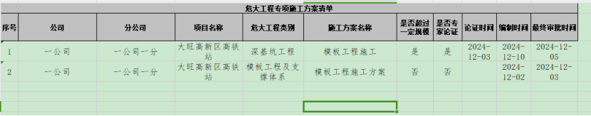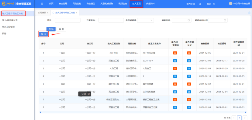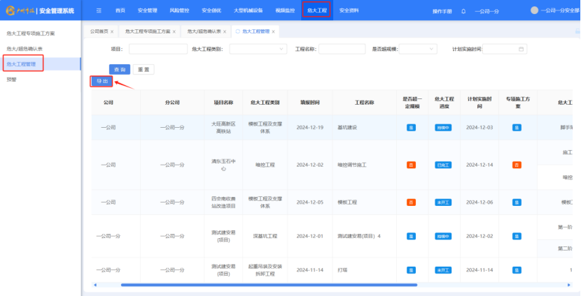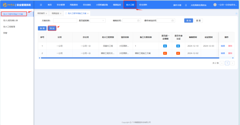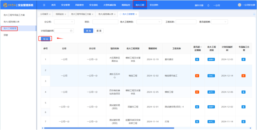 打开“危大工程”-“危大工程专项施工方案”,点击“导出”按钮,将数据导出为excel。