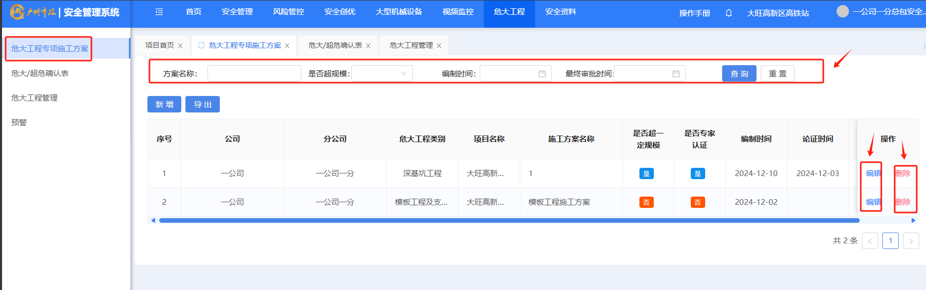 打开“危大工程”-“危大工程专项施工方案”筛选完条件后,点击“查询”按钮,对施工方案进行筛选,点击“重置”按钮,对筛选进行重置。选“编辑”对施工方案进行编辑,选“删除”对施工方案进行删除。
