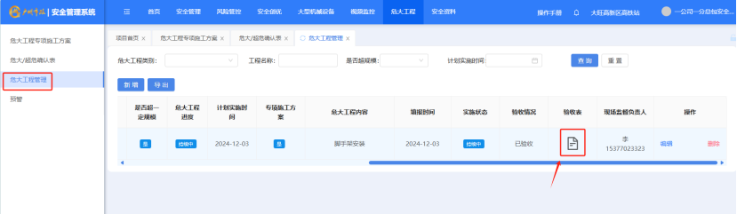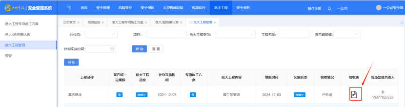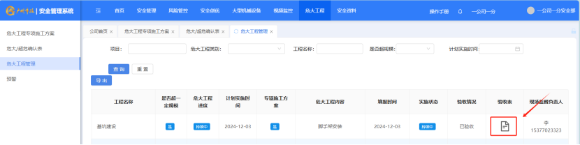 打开“危大工程”-“危大工程管理”点击“验收表”图标,对验收表进行下载,下载为excel。