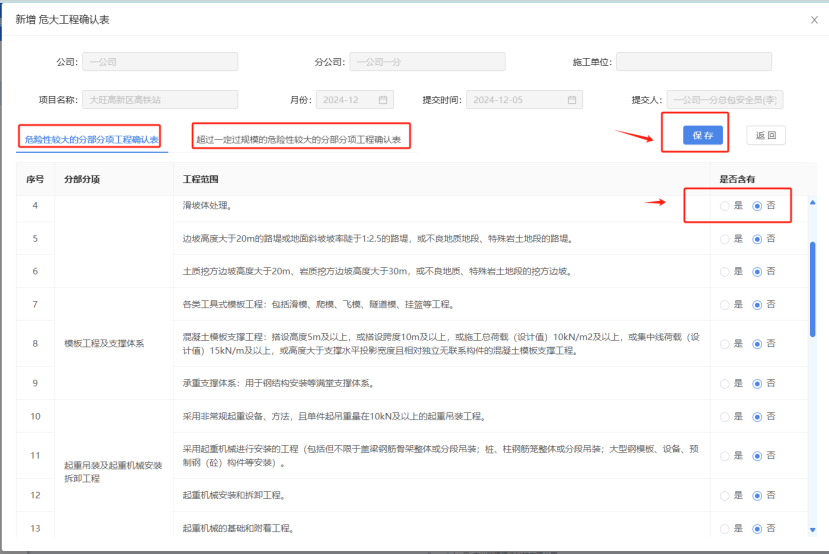 打开“危大工程”-“危大超危确认表”点击“新增”按钮,进入新增页,对“危险性较大的分部分相工程确认表”和“超过一定过规模的危险性较大的分部分项工程确认表”这两张表,内容进行“是”或“否”填写,然后保存。