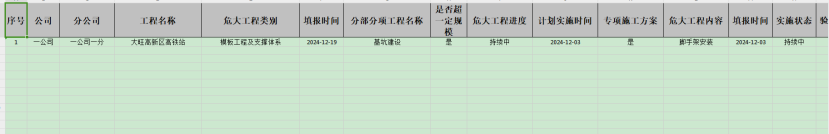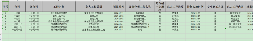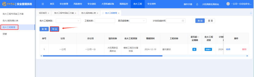 打开“危大工程”-“危大工程管理”点击“导出”按钮,对数据项进行导出。导出的是excel。