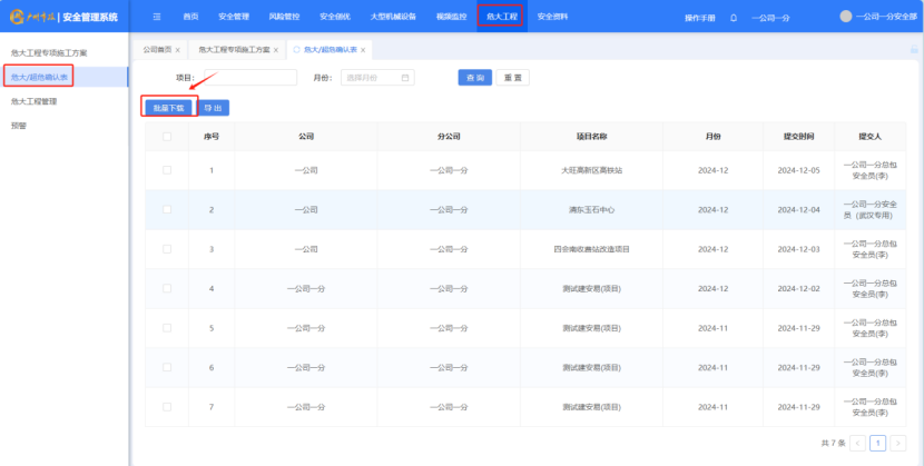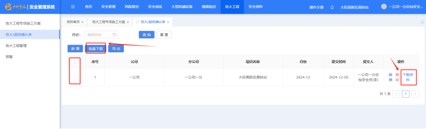 打开“危大工程”-“危大超危确认表”点击左侧小方框然后点击“批量下载”对不同项目的危大超危的确认表进行批量下载。