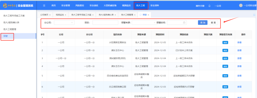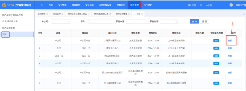 “危大工程”-“预警”添加筛选条件,点击“查看”对预警来源进行查看。