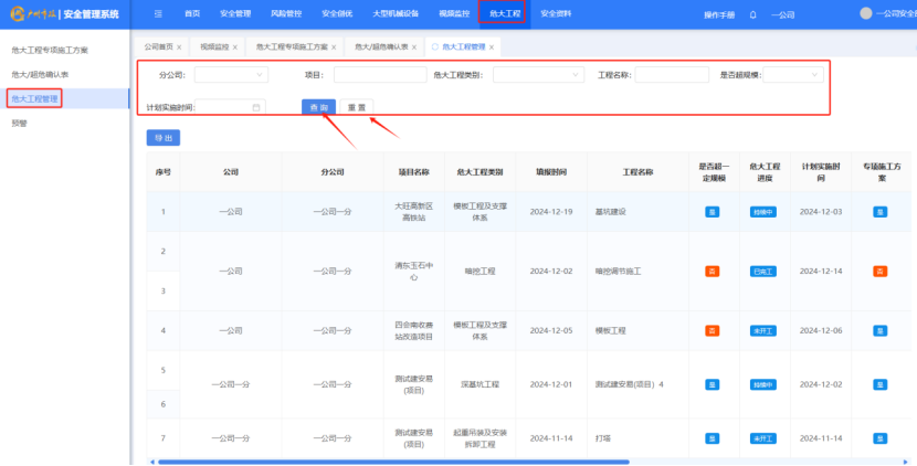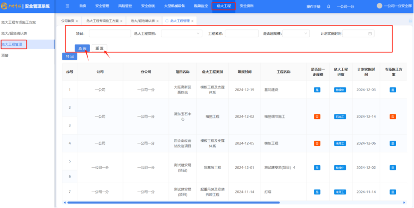 打开“危大工程”-“危大工程管理”筛选完条件后,点击“查询”按钮,对项目进行筛选,点击“重置”按钮,对筛选进行重置。