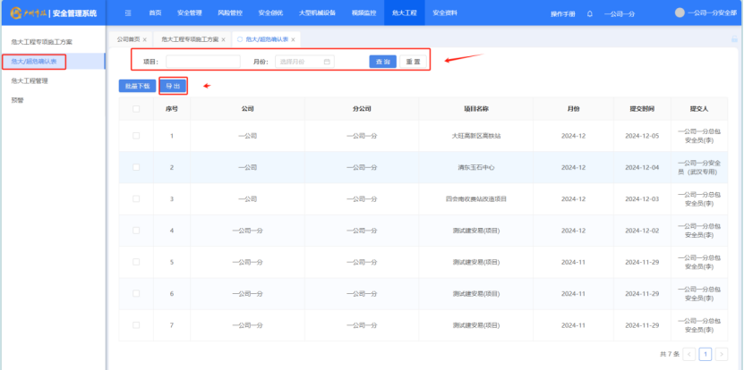 打开“危大工程”-“危大超危确认表”筛选完条件后,点击“查询”按钮,对项目进行筛选,点击“重置”按钮,对筛选进行重置,选“导出”对数据栏数据进行导出,导出为excel。