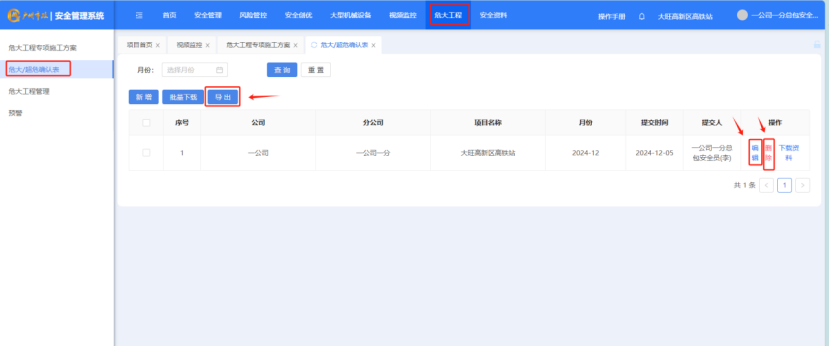 打开“危大工程”-“危大超危确认表”筛选完条件后,点击“查询”按钮,对项目进行筛选,点击“重置”按钮,对筛选进行重置。选“编辑”对确认表进行编辑,选“删除”对确认表进行删除,选“导出”对数据栏数据进行导出,导出为excel。