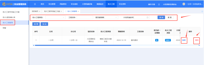 打开“危大工程”-“危大工程管理”对管理的项目进行筛选,也可以点“重置”按钮进行搜索框重置。点“编辑”按钮,对数据项进行编辑,点“删除”按钮对数据项进行删除。