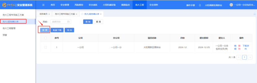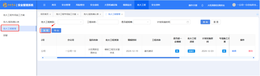 打开“危大工程”-“危大工程管理”点击“新增”按钮,对项目工程进行新增。