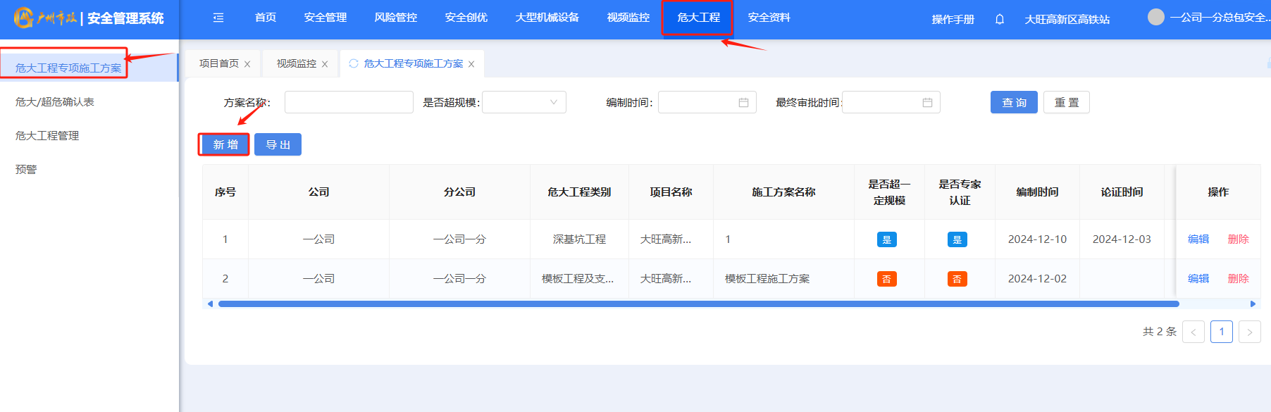 打开“危大工程”-“危大工程专项施工方案”点击“新增”按钮新增施工方案。
