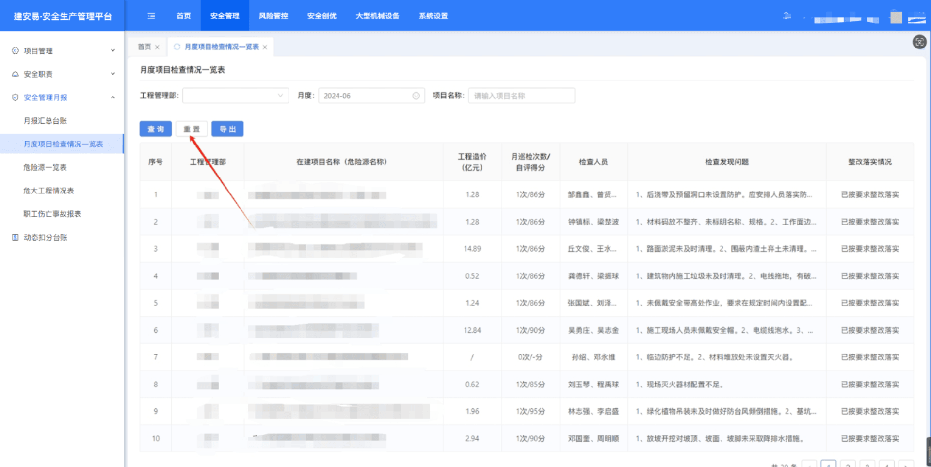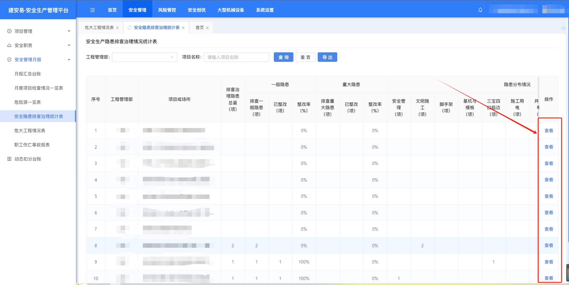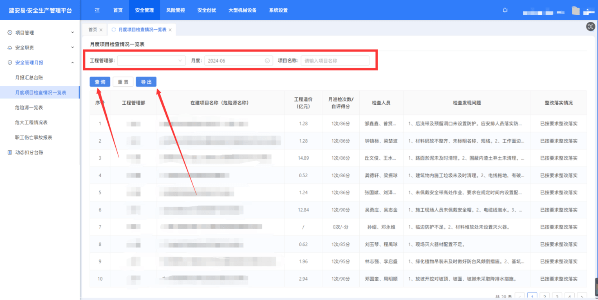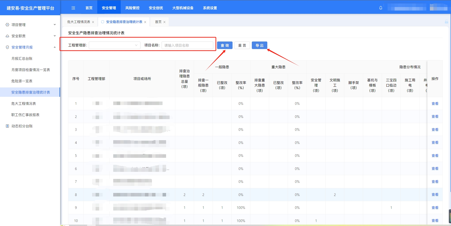 点击“安全管理月报”-“安全隐患排查治理统计表”,筛选分公司、项目名称“查询”,点击“导出”可以下载筛选结果的excel表格。