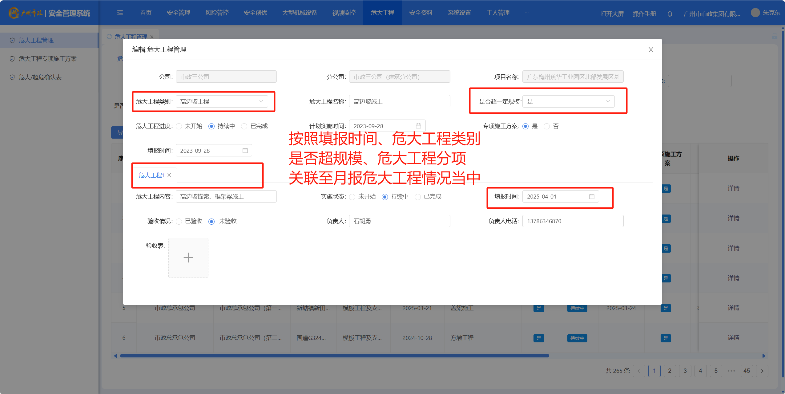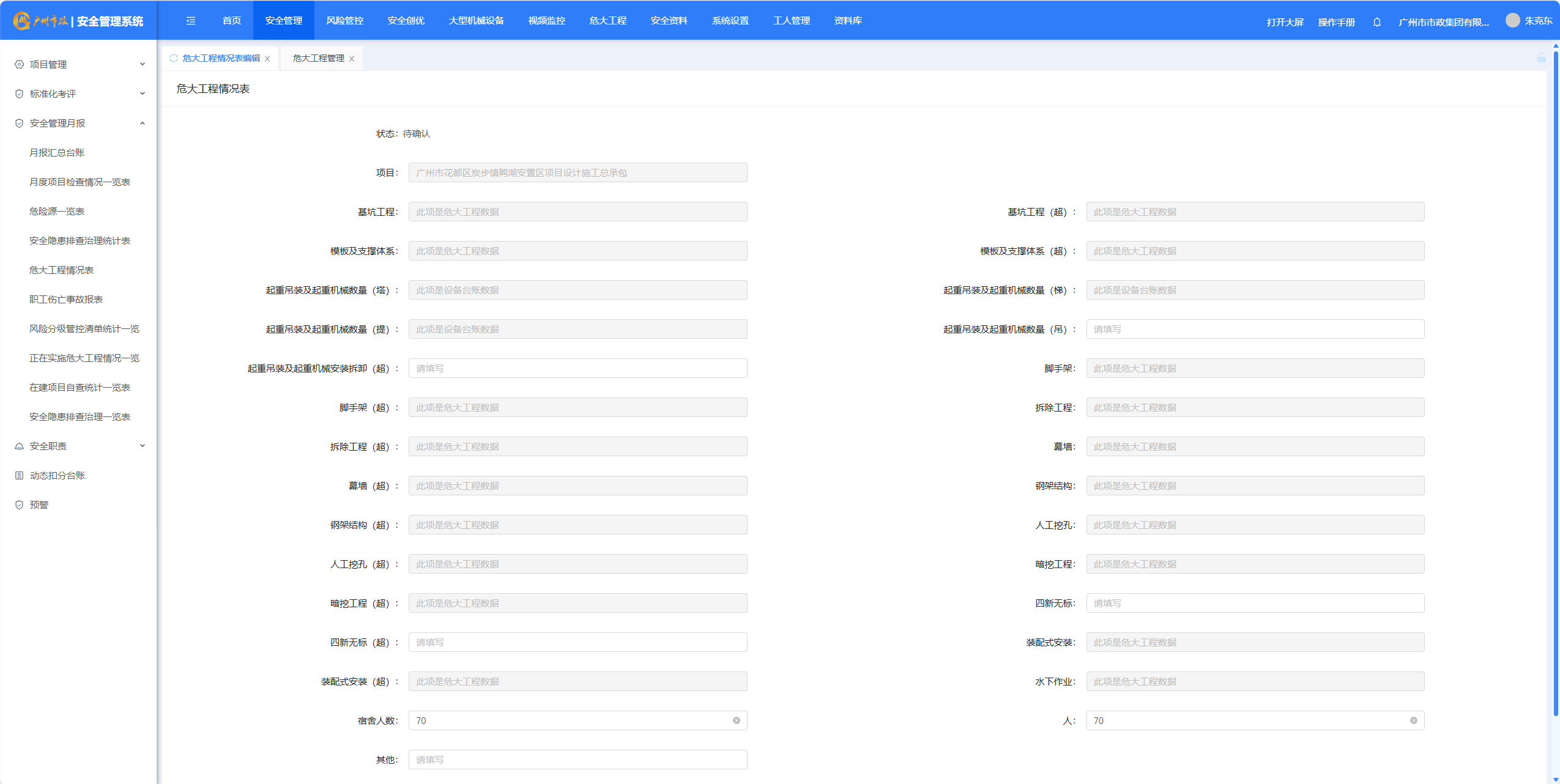 4.2其余危险性较大分部分项数据由危大工程填写的数据联动填充,无需项目人员进行填写;最终由分公司进行确认。