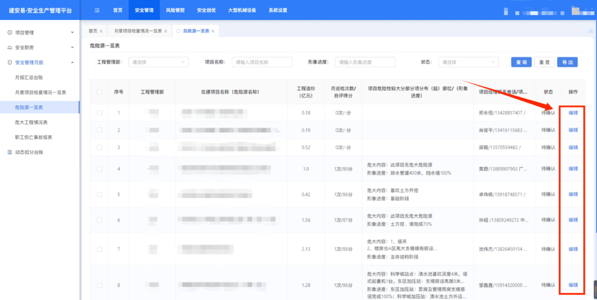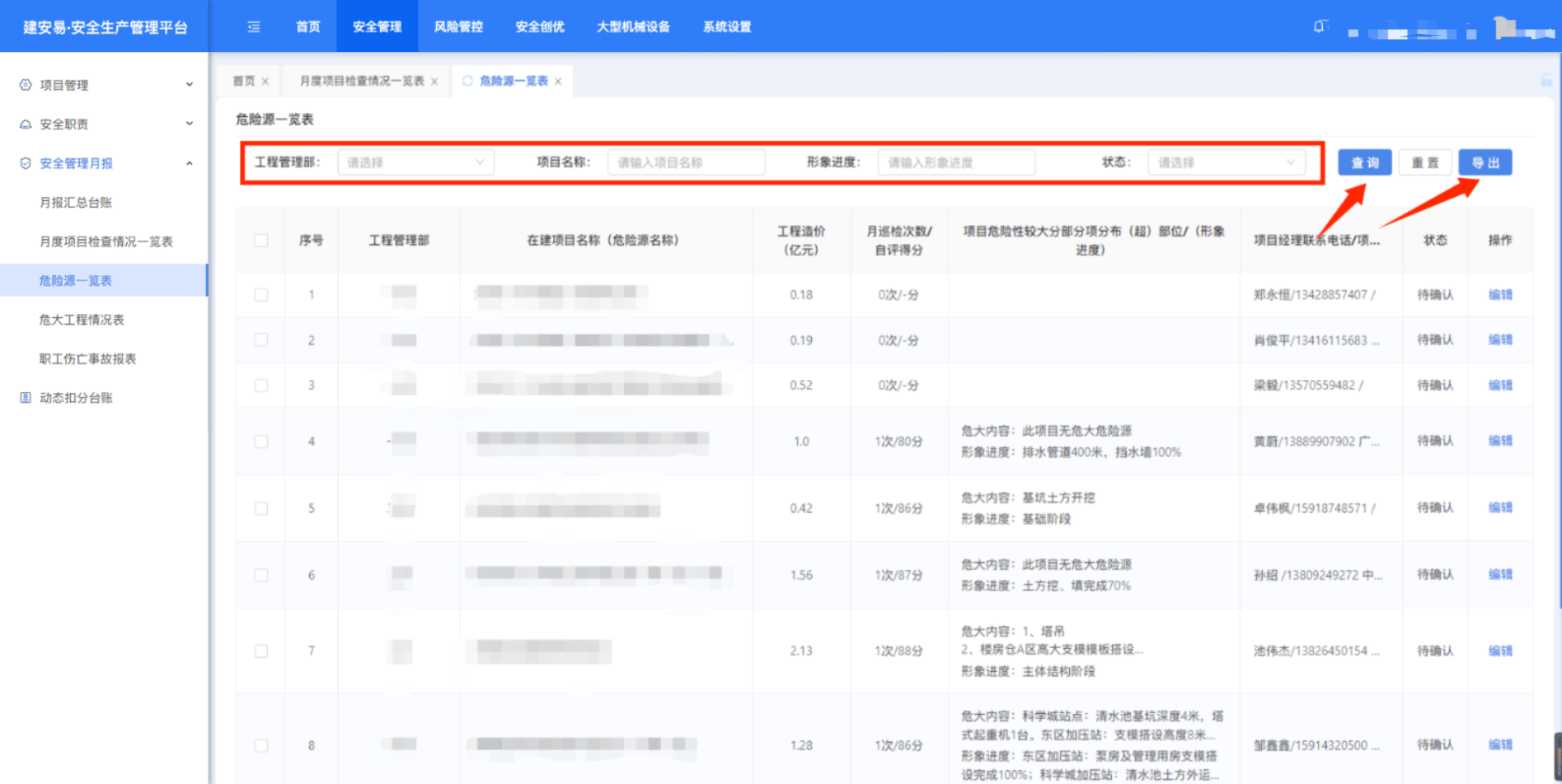 点击“安全管理月报”-“危险源一览表”,筛选分公司、项目名称、形象进度、状态“查询”,点击“导出”可以下载筛选结果的excel表格。